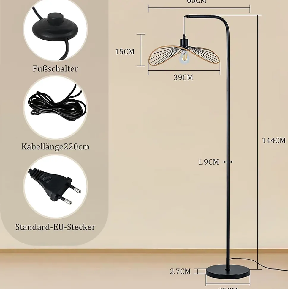 Design Vintage et Charmant : Ce lampadaire industriel Nettlife a une forme de papillon unique. Le corps noir est orné de cordes en papier jaune sur l’anneau extérieur. Il combine minimalisme et style vintage, ajoutant un charme artistique à la pièce.Concept d’Utilisation Pratique : Équipé d’un interrupteur à pied facile à utiliser. La hauteur de l’abat-jour peut être légèrement ajustée via un écrou pour répondre aux différents angles d’éclairage. Douille E27 (sans ampoule), supporte max. 40 W.Gain de Place et Lumière Douce : La structure en forme de L au sol prend peu de place. La conception démontable facilite l’installation et le rangement. Avec un long câble de 220 cm, cette lampe à arc offre une lumière douce et s’adapte à divers agencements.Garantie de Stabilité et Sécurité : La base lourde empêche efficacement le basculement, rendant l’utilisation plus sûre. Le corps en métal rétro et le câble isolé en PVC épais sont durables et garantissent une sécurité électrique.Polyvalent : Que ce soit pour une ambiance cosy dans la chambre, un charme artistique dans le salon ou une atmosphère chaleureuse dans la salle à manger, ce lampadaire Nettlife maîtrise tout. Idéal pour les chambres, salons, bureaux et maisons d’hôtes.