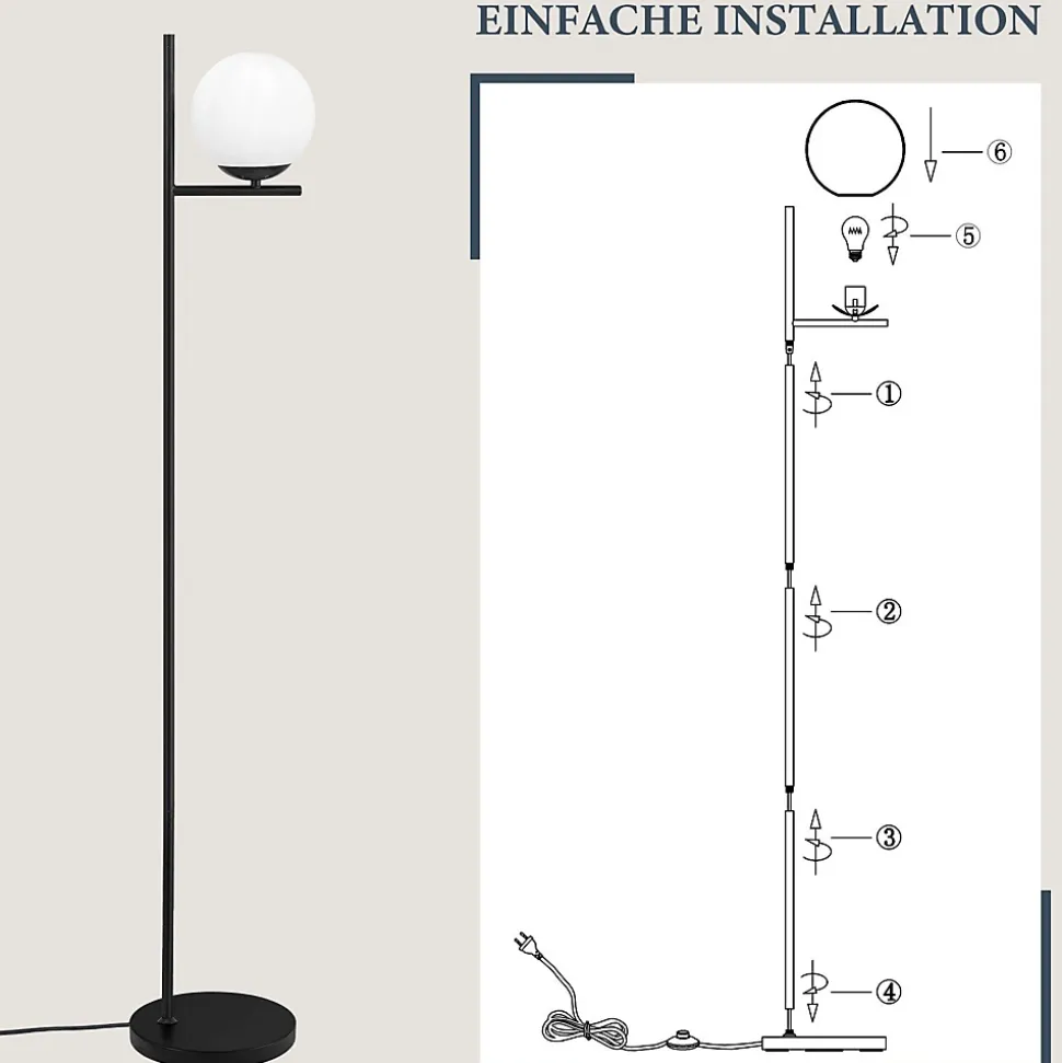 【Matériau de haute qualité】 Cette lampe sur pied est composée d’un métal de haute qualité, d’une base antidérapante noire + d’une tige en métal noir + d’un abat-jour en verre blanc laiteux + d’un interrupteur au pied. L’abat-jour en verre de haute qualité offre une répartition de la lumière douce et uniforme et une grande transmission lumineuse, créant une atmosphère chaleureuse et confortable, rendant votre espace de vie élégant et confortable.【Douille E27 standard】 Cette lampe sur pied est compatible avec une douille E27, vous permettant de choisir différents types d’ampoules selon vos préférences pour répondre à différents besoins d’éclairage et créer différentes ambiances (max. 40W sans ampoule).【Stabilité et praticité】 La lampe sur pied dispose d’une base en métal ronde avec une structure antidérapante en dessous pour assurer une stabilité. Son design pratique avec interrupteur au pied vous permet d’allumer et d’éteindre facilement la lumière en appuyant dessus, sans avoir à vous pencher, pratique et rapide.【Design moderne rétro】 Son design moderne rétro unique en fait un point de mire dans la décoration intérieure. Elle associe élégance moderne et charme nostalgique, s’intègre parfaitement à différents styles de décoration, ajoutant une touche de mode et d’individualité à votre domicile.【Garantie d’achat】 Nous offrons une garantie de 2 ans pour cette lampe. Pour tout problème, suggestion, question ou préoccupation, veuillez nous contacter. Nous vous répondrons dans les 24 heures et résoudrons le problème rapidement.