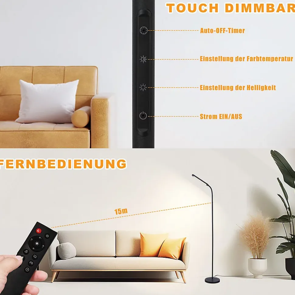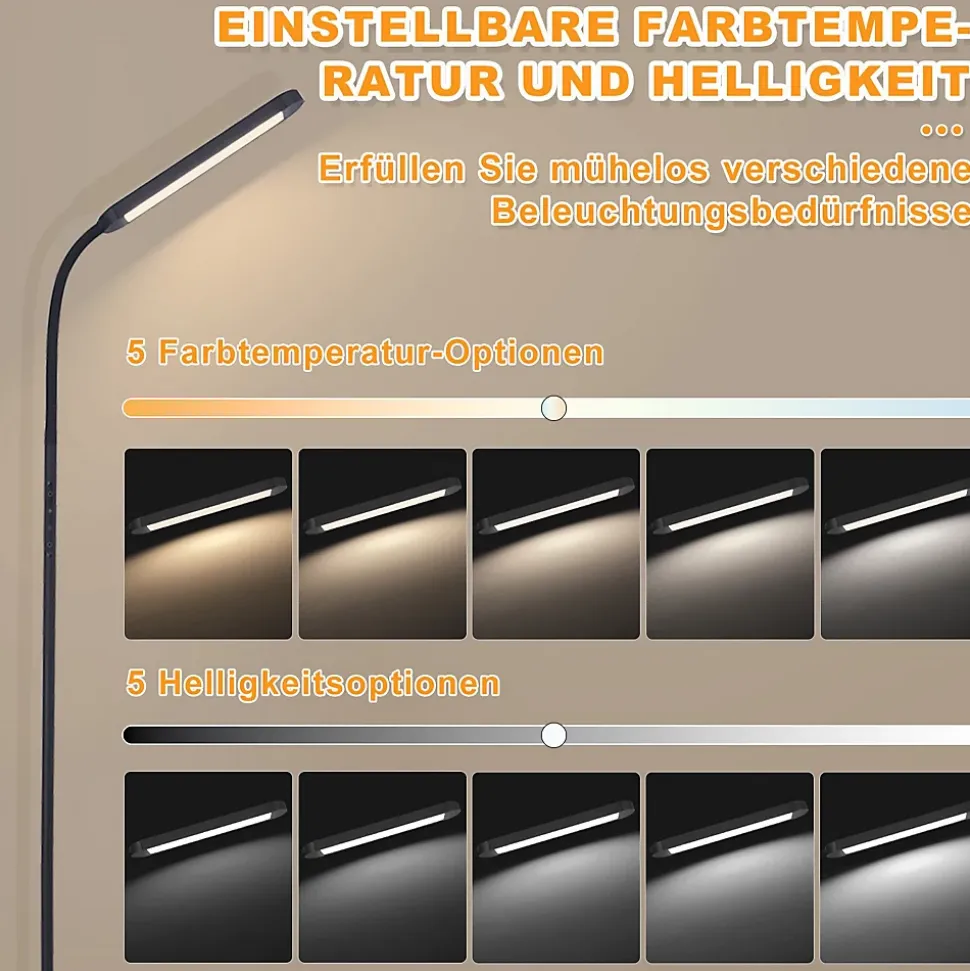 5 températures de couleur et 5 niveaux de luminosité – vous pouvez basculer entre les 5 températures de couleur et niveaux de luminosité avec une pression courte ou avec une pression longue pour une gradation continue (plage de température de couleur 3000k-6500k). Cela vous permet d’ajuster l’intensité lumineuse à vos besoins lorsque vous travaillez, lisez ou vous détendez et de créer un environnement d’éclairage agréable et idéalcol de cygne flexible à 360° – avec un col de cygne flexible et rotatif, la lumière peut être alignée avec précision, idéale pour une utilisation dans le salon, la chambre ou le bureau, parfaite pour lire et apprendrecontrôle intelligent et fonction minuterie – ce lampadaire led peut être contrôlé soit par le toucher, soit par une télécommande avec une portée allant jusqu’à 15 mètres. Cela vous permet d’utiliser le lampadaire confortablement depuis votre canapé ou votre lit sans avoir à vous lever. Ceci est particulièrement adapté si vous utilisez la lampe comme lampe de chevet ou comme lampe de lecture. Avec une minuterie de 60 minutes, la lampe s’éteint automatiquement – idéal pour une utilisation avant d’aller au litmontage facile et matériaux de haute qualité – fabriqué en fer et aluminium robustes, disponible en noir ou blanc ; le design minimaliste s’intègre dans n’importe quel intérieur et le montage se fait en quelques minutes seulement. Avec sa base plus large et plus lourde, ce lampadaire est très sûr pour les enfants et les animaux domestiques car il ne bascule pas facilement.mode veilleuse et protection des yeux – le lampadaire à intensité variable est équipé de led à faible consommation d’énergie, cri> 80, qui sont sans scintillement et sans éblouissement pour éviter la fatigue oculaire causée par le scintillement ou la lumière vive. Il dispose également d’un mode veilleuse, parfait pour les personnes âgées et les enfants à la maison pour les aider à mieux dormir