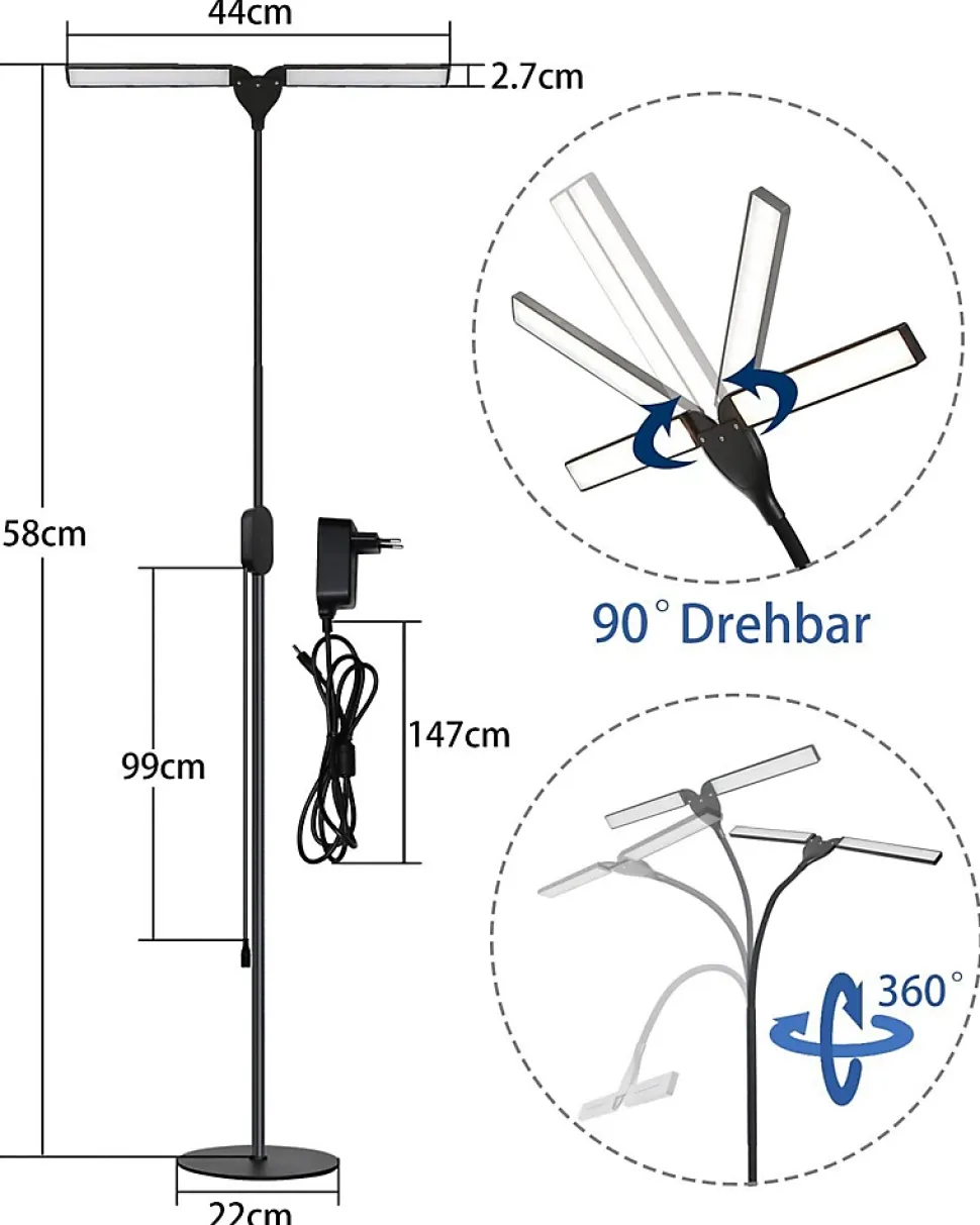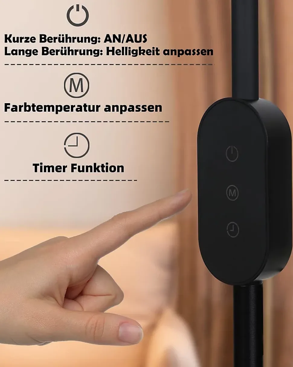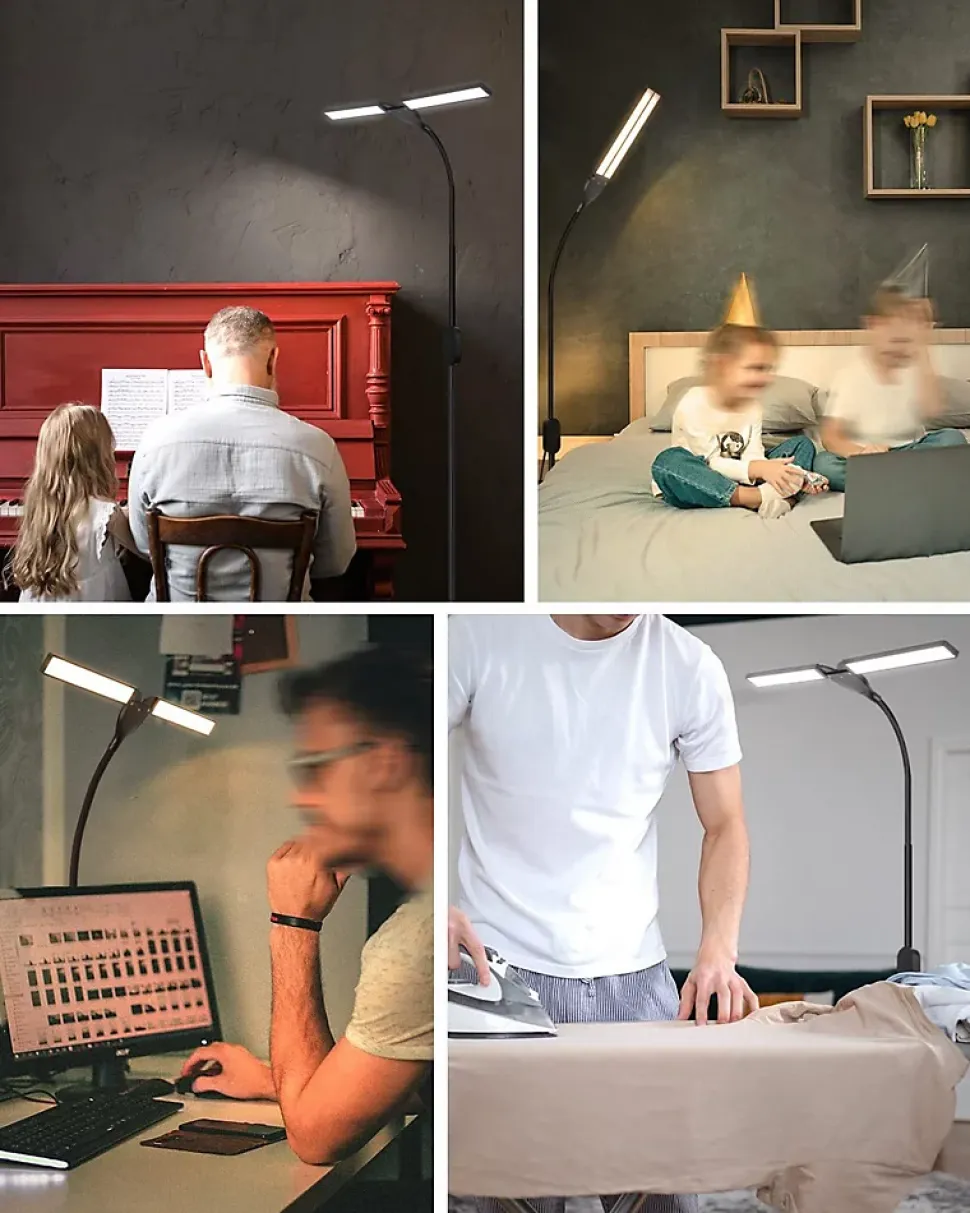【Température de couleur et luminosité réglables】Les lampadaires LED conviennent parfaitement pour éclairer les bureaux, les chambres et les salons. La LED intégrée émet une lumière vive, et les utilisateurs peuvent ajuster la température de couleur (3000K-5000K) et la luminosité (20%-100%) via les boutons de commande pour s’adapter à différents environnements.【Minuterie et fonction mémoire】Le lampadaire dispose d’une fonction minuterie de 40 minutes. Appuyez longuement sur le bouton de minuterie, le lampadaire clignote deux fois pour activer la fonction, puis s’éteint automatiquement après 40 minutes. Il possède également une fonction de mémoire qui conserve la dernière température de couleur et luminosité réglées tant que l’appareil reste allumé.【Détails techniques】Puissance : 10WTempérature de couleur : 3000K-5000KLuminosité : 20%-100%Longueur du câble : 147 cmMatériaux : Fer et aluminiumMode d’alimentation : Entrée AC100-240V 50/60Hz, sortie DC5VAngle de rotation maximal : 90°【Col flexible et LED de haute qualité】Le col de cygne réglable à 360° offre une flexibilité maximale pour diriger la lumière exactement là où vous en avez besoin. Les LED de haute qualité émettent une lumière sans scintillement ni éblouissement, protégeant ainsi vos yeux de la fatigue même après de longues heures d’utilisation.【Cadeau idéal】Ce lampadaire est un cadeau parfait pour toute occasion. Il convient également aux enfants, aux parents, aux couples, aux amis et aux clients. Utilisable comme veilleuse, lampe de chevet, lampe de lecture, lampadaire d’angle ou lampe de bureau, il est adapté au salon, à la chambre, au bureau et au bureau.