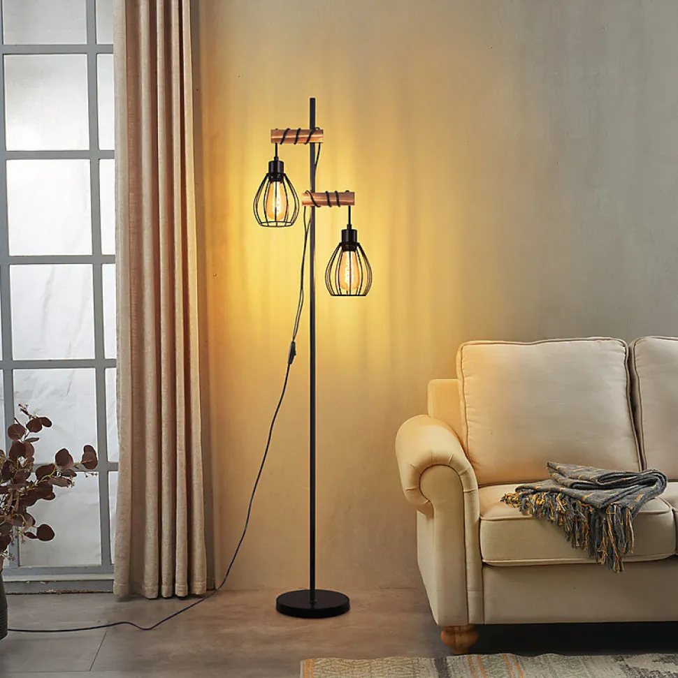 DESIGN : Ce lampadaire allie avec raffinement métal et bois flammé. Ses câbles noirs s’enroulent naturellement autour des poutres en bois et son abat-jour noir en forme de cage crée une atmosphère rétro-industrielle affirmée.DOUBLE INTERRUPTEUR : Ce lampadaire noir est équipé de deux interrupteurs indépendants permettant de contrôler chaque tête de lampe séparément, vous permettant ainsi de répondre facilement à vos différents besoins d’éclairage. Que vous souhaitiez créer une ambiance chaleureuse ou vous concentrer sur la lecture, vous pouvez changer d’interrupteur en toute flexibilité pour une expérience plus personnalisée et confortable.CARACTÉRISTIQUES TECHNIQUES : Hauteur totale du lampadaire : 152 cm ; Diamètre de la base : 23 cm ; Hauteur de l’abat-jour : 14,7 cm ; Diamètre de l’abat-jour : 14,5 cm ; Longueur du câble : 310 cm ; Douille : E27 (max. 25 watts) ; Remarque : Ampoules non incluses.INSTALLATION FACILE : Ce lampadaire vintage est très facile à installer. Suivez simplement les instructions et serrez la tige section par section. Aucun outil supplémentaire n’est requis. L’assemblage peut être réalisé par une seule personne, ce qui permet de gagner du temps et de l’énergie.UTILISATIONS MULTIPLES : Ce lampadaire de style vintage est parfait pour le salon, la chambre, le bureau ou un coin, apportant chaleur et style à votre intérieur. Son design simple et généreux en fait un cadeau idéal pour la famille, les amis ou les collègues, à la fois pratique et élégant.