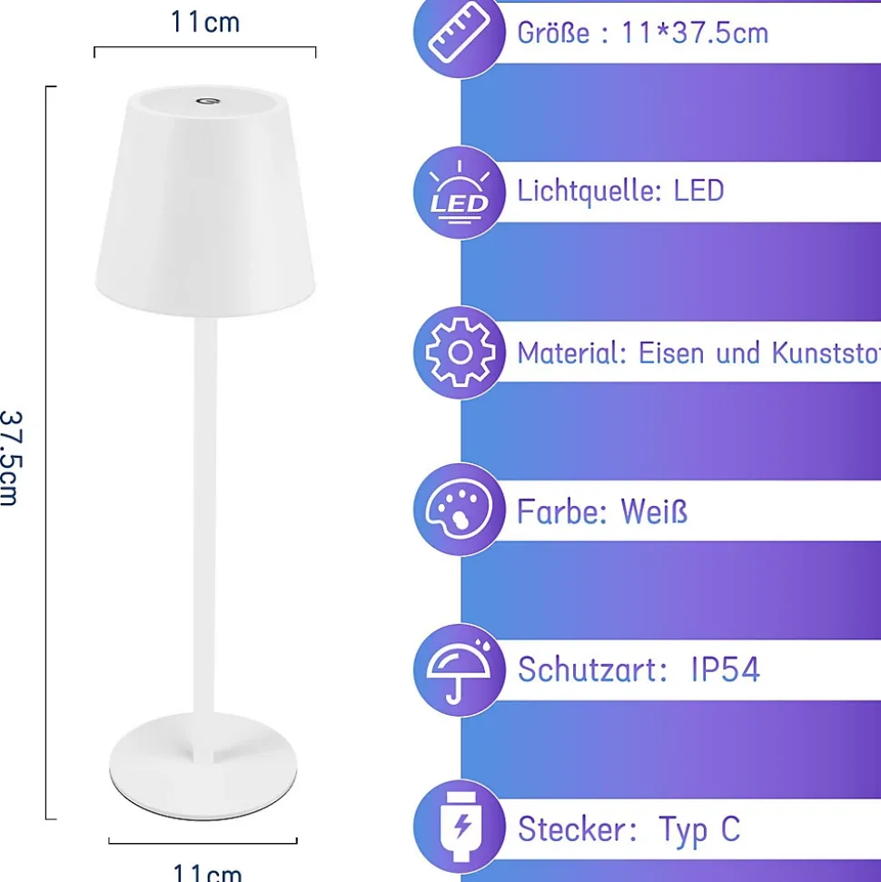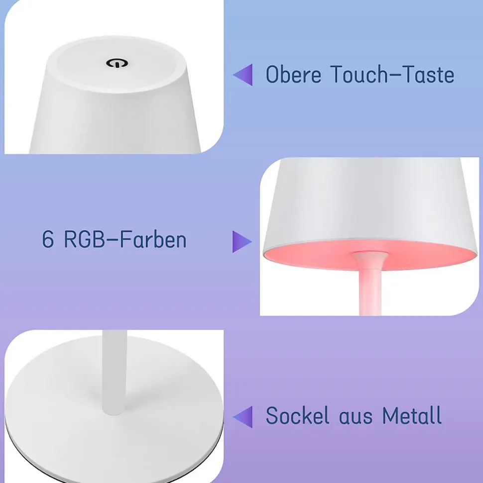 【Lampe à batterie tactile à intensité variable】 La lampe de table LED à intensité tactile est très simple et conviviale à utiliser. Lors de son utilisation, une légère pression suffit pour régler la lumière selon les besoins. La lampe de table a un total de 3 niveaux. Appuyez brièvement pour régler la couleur de la lumière (3 000-6 500 K) ; appuyez longuement pour régler la luminosité (0-100 %).【Mobile et rechargeable】 La lampe à batterie rechargeable peut être utilisée de deux manières. Peut être ouvert et utilisé pendant le chargement. Une fois la lampe batterie complètement chargée, vous pouvez débrancher le port USB et l’utiliser n’importe où utilisation dans la maison. Très flexible et confortable. Il peut également être utilisé comme éclairage de secours dans les situations d’urgence.【Lampe de chevet LED efficace】 La lampe de table LED à batterie sans fil est dotée d’une batterie au lithium intégrée de 2 600 mAh, qui peut continuer à fonctionner pendant 9 heures après une charge complète (en fonction de la luminosité de travail). La table de lampe est avec équipé d’un câble de chargement USB Type-C. La charge complète ne prend que 3 heures, vous pouvez donc utiliser la lampe de table sans souci.【Lampe de table LED 6 couleurs RVB】 En plus d’être équipée de trois températures de couleur de base pour protéger vos yeux, la lampe de bureau LED sans fil offre également 6 options de lumière de couleur sur simple pression d’un bouton. De cette façon, tu n’as pas à t’inquiéter La décoration de diverses soirées à thème et couloirs de jardins potagers prendra soin et ajoutera plus d’émotion et d’atmosphère à votre maison.【Design portable classique】La lampe de table a un design simple et élégant. La hauteur de 37,5 cm s’adapte à n’importe quelle table, placard et bar. La lampe de bureau LED d’extérieur à piles est étanche. Conception IP54, vous pouvez donc l’utiliser pour l’éclairage intérieur et extérieur.