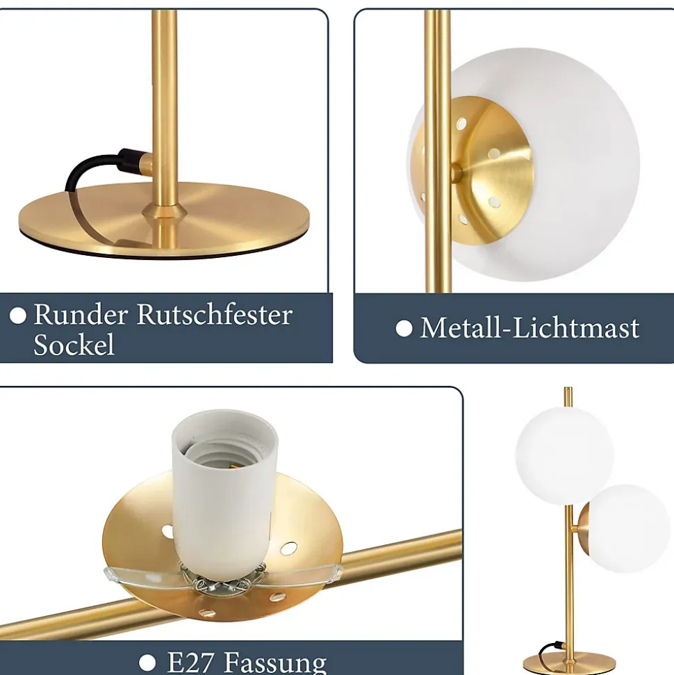 Matériau : notre lampe de table est fabriquée en métal robuste ; la tige en métal doré et l’abat-jour en verre opale sont parfaitement combinés et donnent à votre espace de vie une touche élégante et moderne ; Avec une base antidérapante noire et un fonctionnement pratique de l’interrupteur à bouton, il est facile à utiliser ; Il convient aux tables de chevet, bureaux, chambres, salons et chambres d’enfantsConception de l’abat-jour en verre : l’abat-jour en verre blanc laiteux assure une répartition douce et uniforme de la lumière avec une transmission lumineuse élevée, créant une atmosphère lumineuse chaleureuse et confortable. Le design unique de l’abat-jour ajoute une touche élégante et confortable à votre pièce. L’abat-jour en verre est facile à nettoyer et présente une conception amovible pour un remplacement facileDouille standard E27 : notre lampe de chevet utilise une douille filetée standard E27, qui offre une compatibilité élevée. Vous pouvez choisir librement différents types de lampes pour répondre à vos besoins d’éclairage individuels et créer différentes ambiances (puissance maximale 25WX2). Qu’il s’agisse d’une lumière vive ou d’un éclairage d’ambiance doux, cette lampe de table vous permet de l’ajuster librement pour obtenir l’effet souhaitéDétails techniques : Dimensions de la lampe de table : 45 x 21,5 cm, diamètre de l’abat-jour en verre : 15 cm, diamètre du pied : 15 cm. Equipé d’un câble d’alimentation de 150 cm de long pouvant être allumé et éteint à l’aide de l’interrupteur présent sur le câble (sans ampoule)Service client : si vous avez des questions sur nos lampes, veuillez nous contacter à tout moment. Nous vous répondrons dans les 24 heures. Si vous avez d’autres questions, veuillez cliquer sur « Contacter le vendeur » pour nous contacter. Nous ferons de notre mieux pour résoudre votre problème.