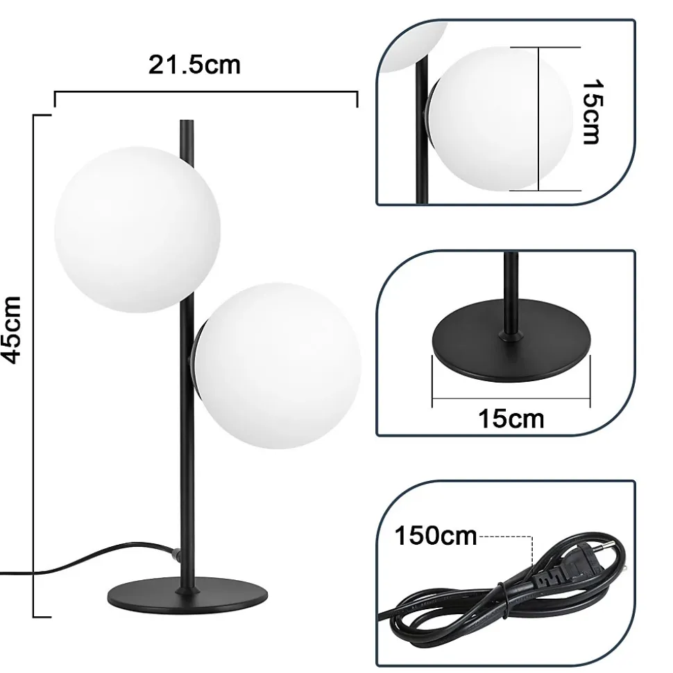 Matériau : notre lampe de table est en métal, la tige en métal doré et l’abat-jour en verre opale sont combinés, donnant à votre espace de vie une touche élégante et moderne. Avec une base antidérapante noire et un fonctionnement pratique de l’interrupteur à bouton, il est facile à utiliser. Il convient aux tables de chevet, bureaux, chambres, salons, chambres d’enfantsConception de l’abat-jour en verre : l’abat-jour en verre blanc laiteux assure une répartition douce et uniforme de la lumière avec une transmission lumineuse élevée, créant une atmosphère lumineuse chaleureuse et confortable. Le design unique de l’abat-jour ajoute une touche élégante et confortable à votre pièce. L’abat-jour en verre est facile à nettoyer et présente une conception amovible pour un remplacement facileDouille standard E27 : notre lampe de chevet utilise une douille filetée standard E27, qui offre une compatibilité élevée. Vous pouvez choisir librement différents types de lampes pour répondre à vos besoins d’éclairage individuels et créer différentes ambiances (puissance maximale 25WX2). Qu’il s’agisse d’une lumière vive ou d’un éclairage d’ambiance doux, cette lampe de table vous permet de l’ajuster librement pour obtenir l’effet souhaitéDétails techniques : Dimensions de la lampe de table : 45 x 21,5 cm, diamètre de l’abat-jour en verre : 15 cm, diamètre du pied : 15 cm. Equipé d’un câble d’alimentation de 150 cm de long pouvant être allumé et éteint à l’aide de l’interrupteur présent sur le câble (sans ampoule)Service client : si vous avez des questions sur nos lampes, veuillez nous contacter à tout moment. Nous vous répondrons dans les 24 heures. Si vous avez d’autres questions, veuillez cliquer sur « Contacter le vendeur » pour nous contacter. Nous ferons de notre mieux pour résoudre votre problème