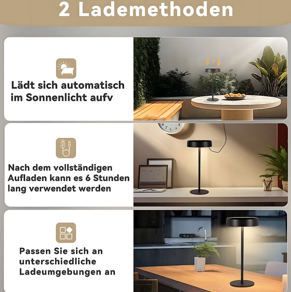 Lampe de bureau LED tactile à intensité variable : la lampe de bureau LED tactile à intensité variable est très facile à utiliser et conviviale. Lors de l’utilisation, une légère pression suffit à régler la lumière selon les besoins. La lampe de bureau dispose d’un total de 3 niveaux. Appuyez brièvement pour régler la couleur de la lumière (3000-5000K)Portable et rechargeable : la lampe à batterie rechargeable peut être utilisée de 3 manières. Il peut être allumé et utilisé pendant la charge. Une fois la lampe de batterie complètement chargée, vous pouvez la débrancher via le port USB et l’utiliser n’importe où dans votre maison. Il peut être chargé par l’énergie solaire à l’extérieur pendant la journée et peut également être utilisé comme éclairage de secours en cas d’urgenceLampe de chevet LED efficace : la lampe de bureau LED sans fil dispose d’une batterie au lithium intégrée de 3600 mAh, qui peut continuer à fonctionner pendant 6 heures après une charge complète (selon la luminosité de travail). La table lumineuse est livrée avec un câble de chargement USB Type-C. La charge complète ne prend que 4,5 heures, vous pouvez donc utiliser la lampe de bureau sans souci.Large gamme d’utilisations : la lampe de jardin à piles est étanche IP44 et peut être placée non seulement à l’intérieur comme dans les chambres et les salons, mais également à l’extérieur sur les balcons et les couloirs. Vous pouvez l’utiliser pour lire et écrire, ou l’utiliser comme décoration dans les bars et les fêtes pour ajouter plus d’ambianceConception portable classique : la conception de la lampe de bureau est simple et élégante. La hauteur de 30 cm s’adapte parfaitement à n’importe quelle table, armoire et plateau de bar. Cette lampe de table est disponible en 2 couleurs – noir et blanc, vous permettant ainsi de donner à votre maison un style différent.