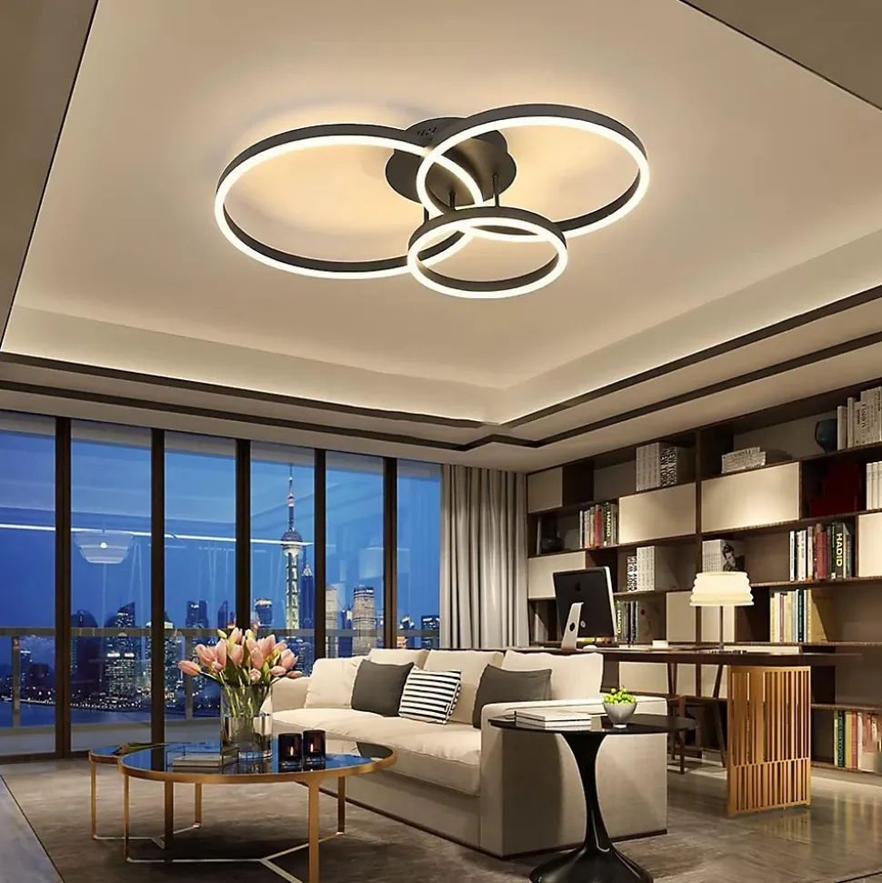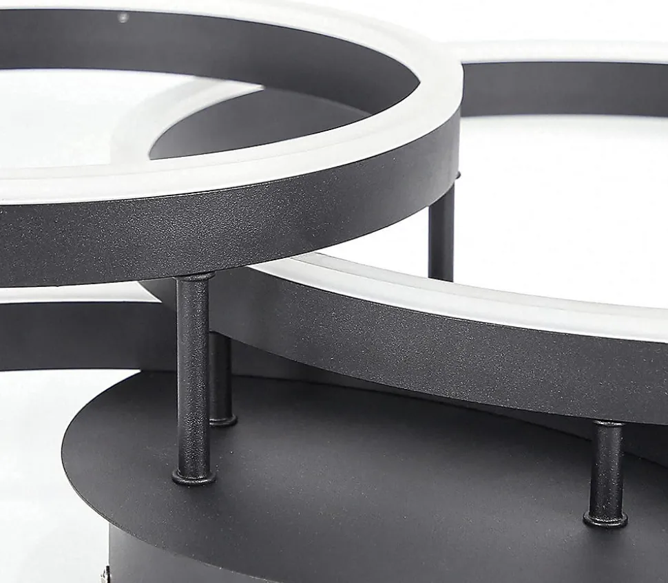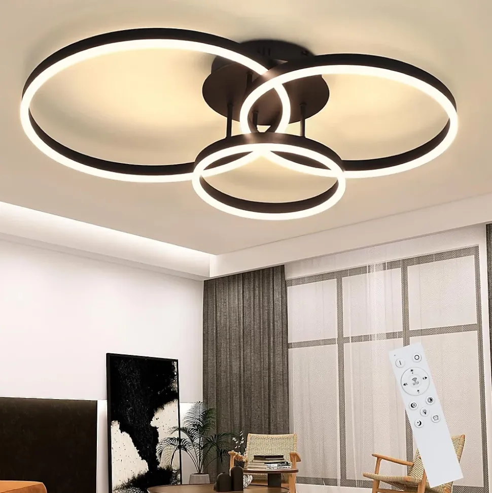 Design moderne et créatif :Découvrez ce plafonnier de salon unique, composé de trois anneaux de tailles différentes en aluminium et acrylique. Cette combinaison offre une excellente luminosité, idéale pour les grandes pièces. Qualité de la lumière à intensité variable :Avec une télécommande, vous pouvez contrôler en continu la luminosité et régler la température de couleur du blanc froid au blanc chaud. Cela vous permet de créer l’ambiance lumineuse exactement selon vos idées. Données techniques :Dimension du produit : environ 825815 cm. Dimensions de la plaque de plafond : environ Ø24*3,6 cm. Consommation électrique : 74 watts. Le beau plafonnier avec son ensemble éclaire de manière optimale chaque pièce. Température de couleur : 3000K-6500K. Type d’ampoule : LED. Lampes installées en permanence : Oui. Alimentation : électrique filaire. Tension : 230 V.Application polyvalente :Idéal pour les salons, les chambres, les salles à manger, les bureaux et les couloirs. Cette lumière est également idéale pour les espaces commerciaux et d’exposition tels que les restaurants, les galeries, les cafés et les halls. Il combine une lumière agréable avec la dernière technologie d’éclairage pour créer une atmosphère lumineuse unique. Garantie fiable :Bénéficiez d’une garantie de 2 ans pour protéger votre investissement et être assuré d’un éclairage durable et fiable.