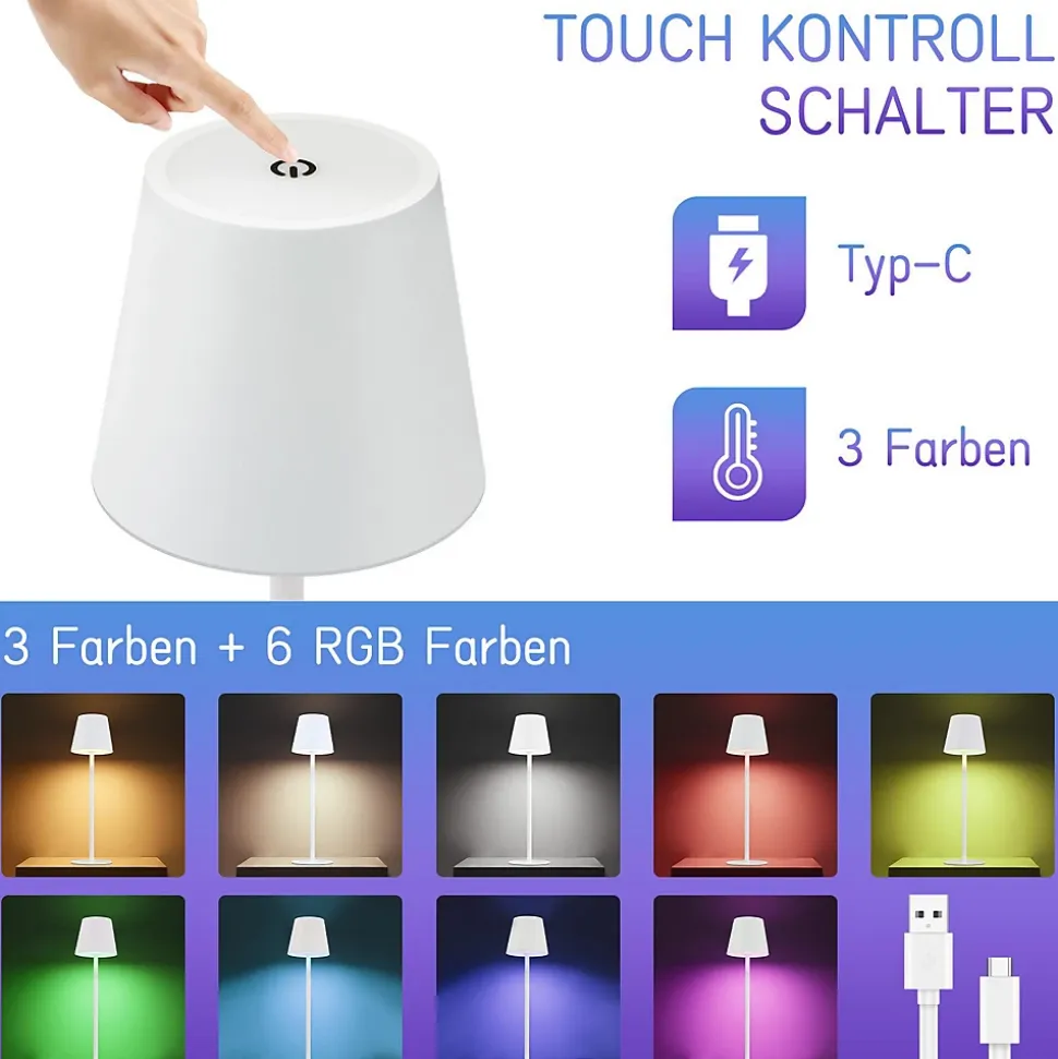 【Lampe à batterie tactile à intensité variable】 La lampe de table LED à intensité tactile est très simple et conviviale à utiliser. Lors de son utilisation, une légère pression suffit pour régler la lumière selon les besoins. La lampe de table a un total de 3 niveaux. Appuyez brièvement pour régler la couleur de la lumière (3 000-6 500 K) ; appuyez longuement pour régler la luminosité (0-100 %).【Mobile et rechargeable】 La lampe à batterie rechargeable peut être utilisée de deux manières. Peut être ouvert et utilisé pendant le chargement. Une fois la lampe batterie complètement chargée, vous pouvez débrancher le port USB et l’utiliser n’importe où utilisation dans la maison. Très flexible et confortable. Il peut également être utilisé comme éclairage de secours dans les situations d’urgence.【Lampe de chevet LED efficace】 La lampe de table LED à batterie sans fil est dotée d’une batterie au lithium intégrée de 2 600 mAh, qui peut continuer à fonctionner pendant 9 heures après une charge complète (en fonction de la luminosité de travail). La table de lampe est avec équipé d’un câble de chargement USB Type-C. La charge complète ne prend que 3 heures, vous pouvez donc utiliser la lampe de table sans souci.【Lampe de table LED 6 couleurs RVB】 En plus d’être équipée de trois températures de couleur de base pour protéger vos yeux, la lampe de bureau LED sans fil offre également 6 options de lumière de couleur sur simple pression d’un bouton. De cette façon, tu n’as pas à t’inquiéter La décoration de diverses soirées à thème et couloirs de jardins potagers prendra soin et ajoutera plus d’émotion et d’atmosphère à votre maison.【Design portable classique】La lampe de table a un design simple et élégant. La hauteur de 37,5 cm s’adapte à n’importe quelle table, placard et bar. La lampe de bureau LED d’extérieur à piles est étanche. Conception IP54, vous pouvez donc l’utiliser pour l’éclairage intérieur et extérieur.