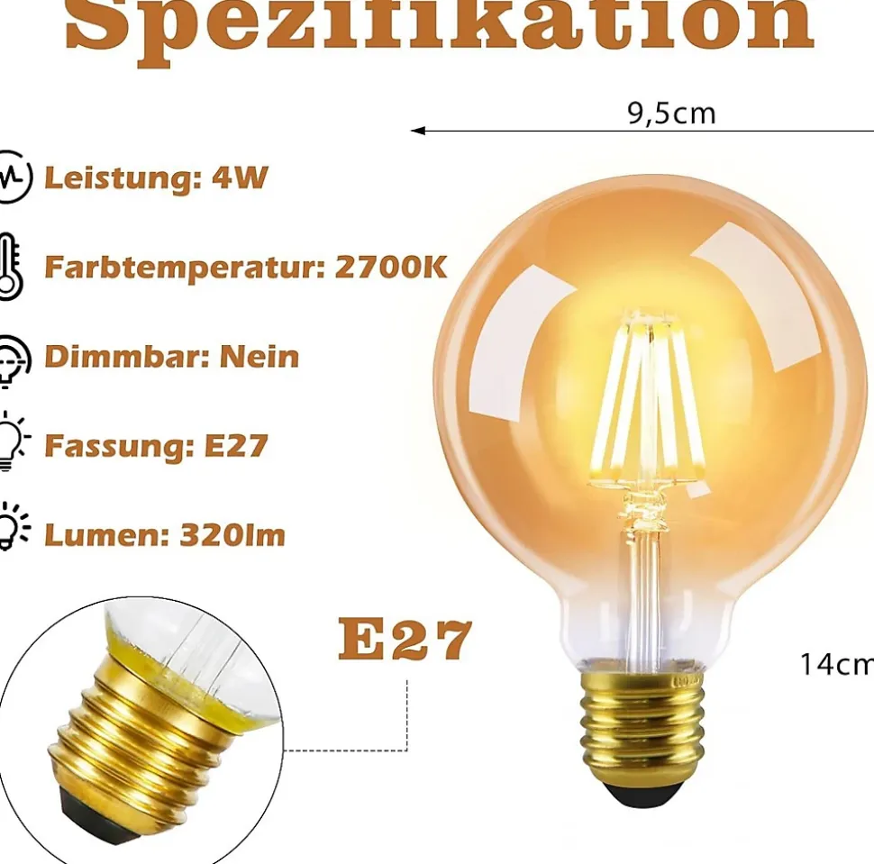 ÉCONOMIE D’ÉNERGIE : Cette ampoule vintage Edison E27 a un effet économe en énergie, remplace la lampe à incandescence conventionnelle de 40 W, une durée de vie moyenne de 20 000 heures, cela permet d’économiser jusqu’à 90 % par rapport aux ampoules classiques ; Avec des filaments LED de haute qualité, la source lumineuse est constante et ne scintille pas.Lumière blanche chaude : cette ampoule rétro Edison émet une lumière blanche chaude de 2 700 K et a une forme sphérique avec un diamètre moyen de 95 mm. La lumière douce et chaude est sans danger pour la peau et les yeux, semble romantique et crée une atmosphère agréablement lumineuse et chaleureuse.Beau design en verre : les ampoules sont en verre et sont très résistantes aux rayures. L’ampoule LED rétro a l’air beaucoup plus chaude et l’ampoule elle-même a une belle couleur qui donne à l’ensemble de l’atmosphère un look rétro nostalgique.Large gamme d’utilisations : idéal pour les salons, chambres, couloirs, maisons, hôtels, cafés, restaurants, galeries d’art, magasins, chambres et bien plus encore. Ces superbes ampoules créent une ambiance merveilleuse qui vous fera sentir détendu et confortable.SERVICE CLIENT : les ampoules LED sont protégées par une garantie de qualité de 2 ans, profitez d’un éclairage LED de haute qualité. Nous souhaitons offrir à nos clients une expérience d’achat de haute qualité. En cas de problème avec le produit, veuillez nous contacter. à temps, nous vous proposerons une solution satisfaisante.