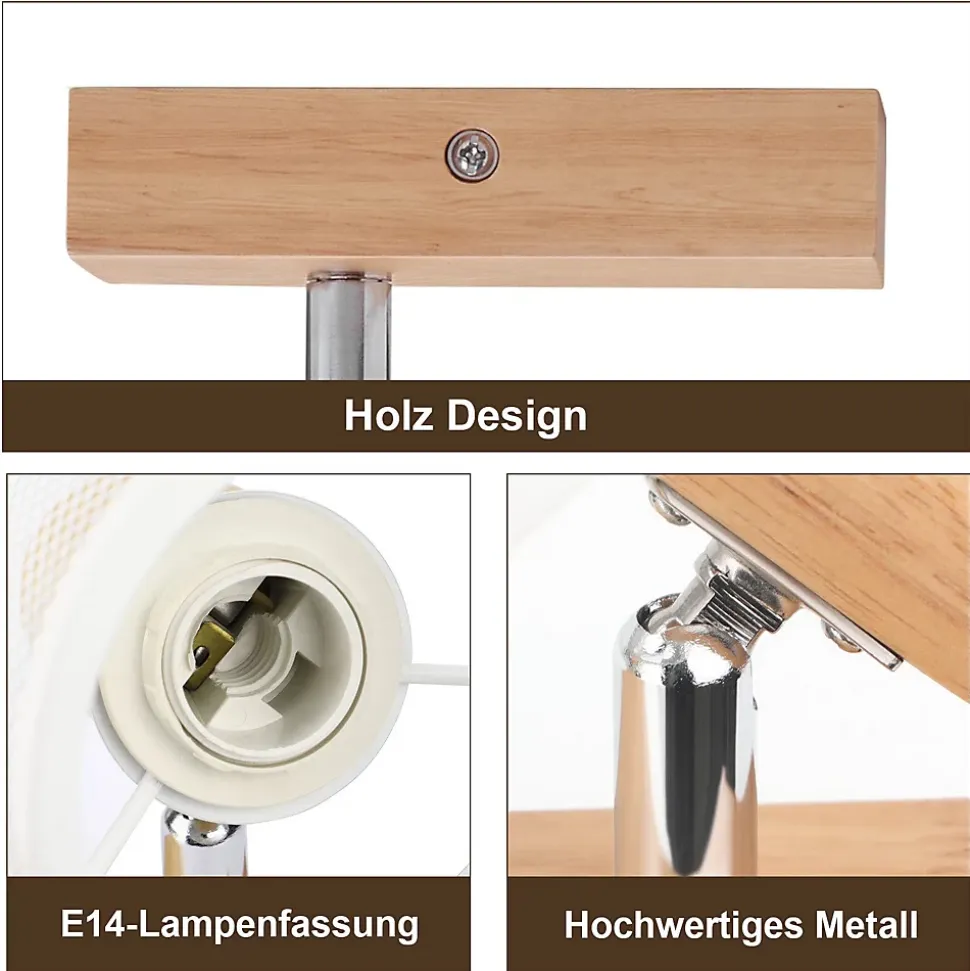 [Design moderne] La base du spot de plafond LED est en bois naturel, qui préserve la texture naturelle, et l’abat-jour est en métal de haute qualité, durable, sûr et fiable. Avec son design simple, cette applique murale en bois s’harmonise non seulement avec les intérieurs de style rétro industriel, mais crée également une atmosphère élégante pour les espaces de vie modernes.[Rotatif et pivotant] Les spots de plafond LED peuvent être inclinés à 90° et tournés à 350°, permettant une installation flexible au mur ou au plafond. Ils peuvent être inclinés dans différentes directions selon les besoins pour éclairer différentes zones de la pièce.[Spot polyvalent] Ce spot de plafond moderne en bois peut être installé au plafond non seulement comme éclairage de salon, de bureau et de chambre à coucher, mais également comme applique murale. Le design de ce plafonnier est moderne et simple, adapté à divers endroits comme la cuisine, la chambre des enfants, le couloir, le bureau, etc.[Douille E14] Le plafonnier est équipé d’une douille E14, afin que vous puissiez choisir librement différents types de lampes et répondre aux besoins d’éclairage individuels pour créer différentes ambiances (puissance maximale 40 W). Attention : nos produits ne contiennent pas d’ampoules.[Garantie d’achat] Nous offrons une garantie de 2 ans sur nos lampes. Si vous avez des questions, des suggestions, des doutes ou des préoccupations, n’hésitez pas à nous contacter. Nous vous répondrons dans les 24 heures et résoudrons le problème dans les plus brefs délais.: