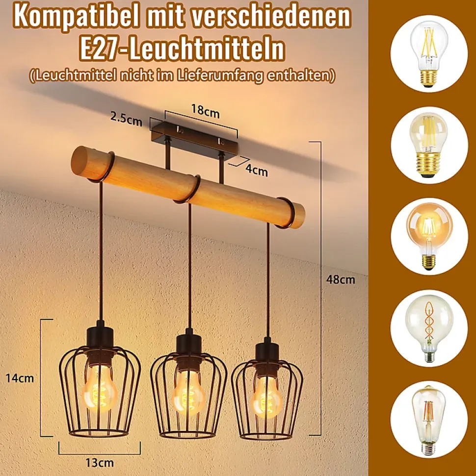 DESIGN INDUSTRIEL : Ce plafonnier allie métal noir et poutres en bois naturel pour un style industriel unique. Il est non seulement élégant, mais garantit également durabilité et stabilité pour une utilisation durable. Il s’intègre parfaitement à tous les intérieurs.Matériaux de haute qualité : la poutre est en bois massif, l’abat-jour et la rosace sont en métal. Grâce à une fabrication soignée, nous veillons à ce que cette lampe de cuisine ne présente aucun bord tranchant. De plus, son pied en métal noir est peint par pulvérisation, inoxydable et facile à installer et à nettoyer.Besoins personnalisés : ce plafonnier de salon est équipé de trois douilles E27 (d’une puissance maximale de 25 W chacune) et peut être utilisé avec des ampoules de différentes luminosités et températures de couleur (par exemple, des ampoules LED blanc chaud ou des ampoules Edison rétro) pour créer une ambiance lumineuse personnalisée.Nombreuses applications : ce plafonnier s’intègre parfaitement dans les chambres, salons, salles à manger, bureaux, salles d’étude, couloirs, cuisines, balcons, restaurants, cafés, bars, hôtels et autres locaux.Combinaisons multiples : outre ce plafonnier, nous proposons d’autres luminaires de la même série, disponibles en différentes tailles et designs, qui s’intègrent facilement dans les chambres, couloirs ou salles à manger pour créer un éclairage harmonieux et uniforme.