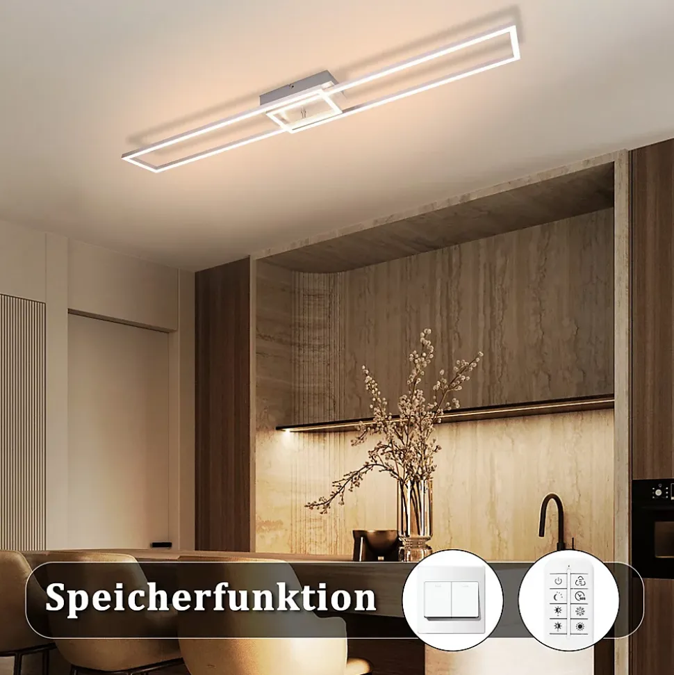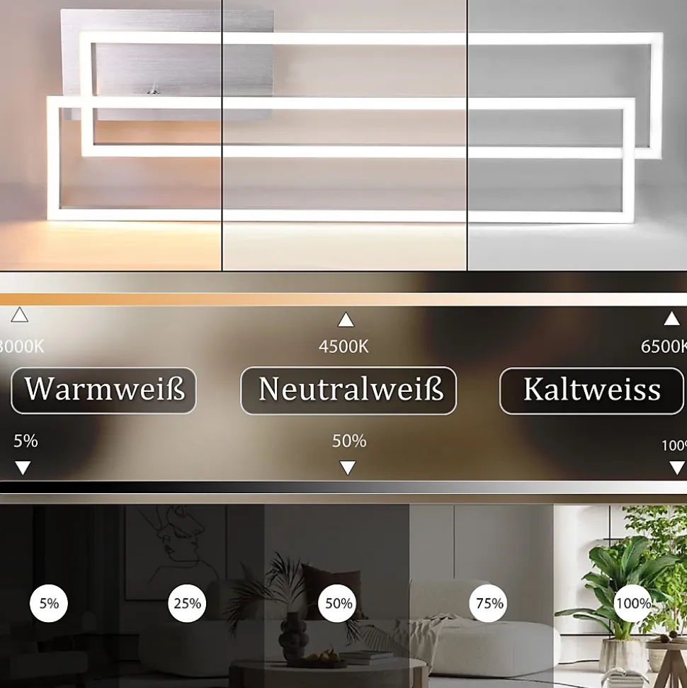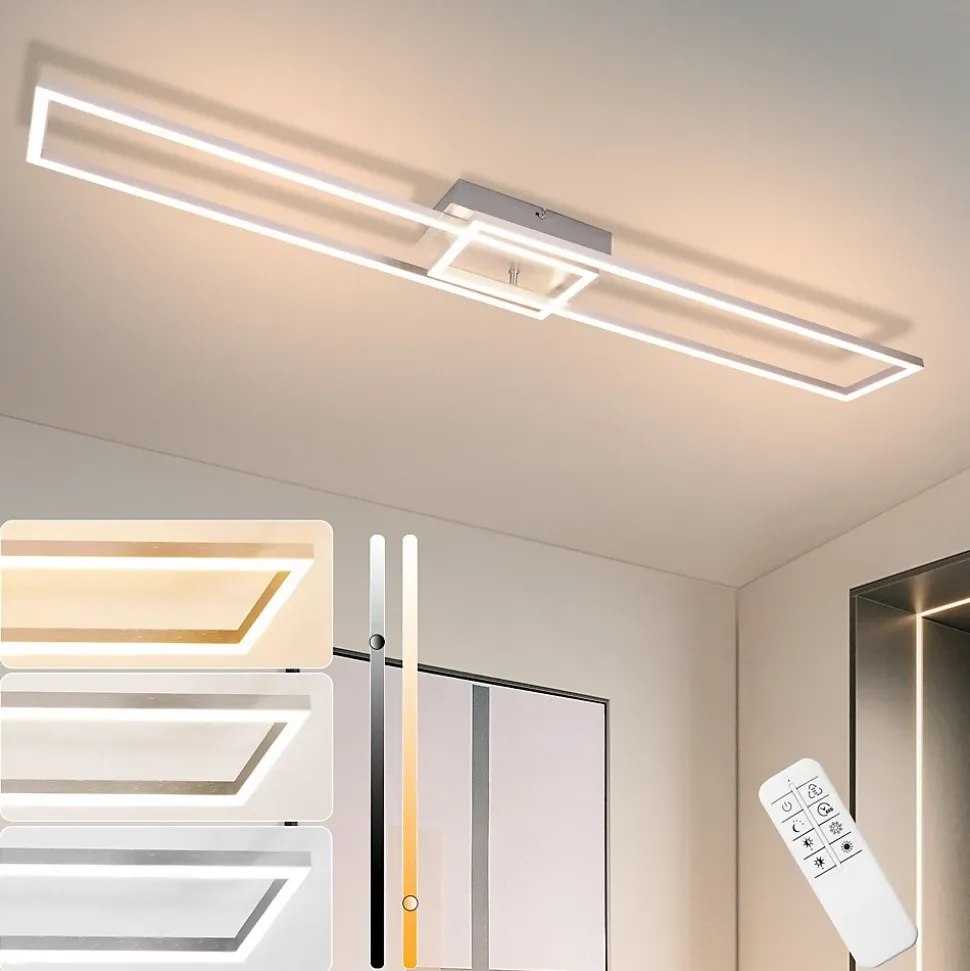 STYLE MODERNE : ce plafonnier LED se distingue par son design géométrique composé de deux rectangles argentés qui se chevauchent. Il s’allume et s’éteint facilement à l’aide d’un interrupteur mural et allie ainsi une esthétique moderne à une utilisation pratique.FONCTION RETARD : le mode nuit de ce plafonnier LED est conçu pour offrir 10 % de luminosité afin de garantir un éclairage doux et non éblouissant la nuit. Il dispose également d’une fonction d’extinction retardée de la lumière qui éteint automatiquement la lumière dans les 60 secondes suivant son activation, ce qui facilite son utilisation la nuit sans avoir à l’éteindre manuellement après l’avoir utilisée.FONCTION DIMMABLE DE LA LUMIÈRE : ce plafonnier a une puissance de 36W qui peut répondre à la plupart des besoins d’éclairage domestique. Il a une température de couleur de 3000K à 6500K, parfaite pour différents besoins de scène, et vous pouvez facilement contrôler la luminosité et la température de couleur de la lumière par la télécommande.POLYVALENT : ce plafonnier en fer et en aluminium a une construction robuste et convient à une grande variété de pièces. Qu’il s’agisse du salon, de la chambre à coucher, de la salle à manger ou du bureau, ce luminaire s’intègre bien dans l’environnement et offre un éclairage généreux et agréable. Il répond à vos besoins d’éclairage quotidiens et souligne le look moderne de votre pièce.MODE PROTECTION DES YEUX : ce plafonnier est doté d’une fonction avancée de protection des yeux qui fournit une lumière non scintillante, claire et douce, agréable pour les yeux. Cela le rend idéal pour une utilisation quotidienne, car il fatigue moins les yeux et offre une expérience visuelle agréable.