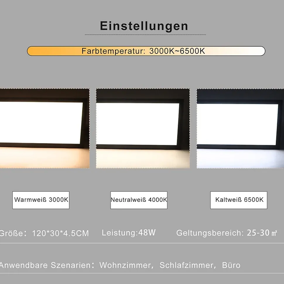 【Matériel】 Le plafonnier LED rectangulaire avec un cadre en aluminium noir et un châssis en fer diffuse la lumière largement et agréablement dans la pièce. Grâce à sa construction moderne, la lampe crée une impression flottante au plafond【Température de couleur dimmable et réglable】 Le panneau LED est dimmable. La température de couleur peut varier de 3 000 K à 6 500 K. Luminosité réglable de 5% à 100%. Avec fonction mémoire : enregistre automatiquement le dernier mode d’allumage. La température de couleur peut également être activée sur les interrupteurs muraux pour commuter rapidement【Économie d’énergie】Avec une puissance lumineuse de 3840 lm, le panneau LED remplace une lampe à incandescence de 200 W. Cela signifie que la lampe de cuisine LED avec une faible consommation d’énergie de 48 W peut économiser plus d’énergie et réduire les coûts d’électricité. Sa durée de vie est de 30 000 heures, ce qui réduit la fréquence de remplacement des lampes.【Conception ultra plate et large application】 Le boîtier du panneau lumineux est ultra-mince et ne mesure que 1 cm. Grâce à son design très plat et à son éclairage sur une grande surface, ce plafonnier est idéal pour les bureaux, mais aussi pour les salons, cuisines, chambres, grands magasins, salles à manger, salles de réunion, couloirs, escaliers, vérandas, garages, etc.【Notes d’installation】 En raison des dimensions plus grandes du produit, l’installation peut être un peu plus difficile. Veuillez noter que lors de l’installation, veillez à ne pas saisir les côtés courts, car cela pourrait plier les côtés longs par des forces extérieures. Si vous rencontrez des problèmes lors de l’installation, n’hésitez pas à nous contacter !