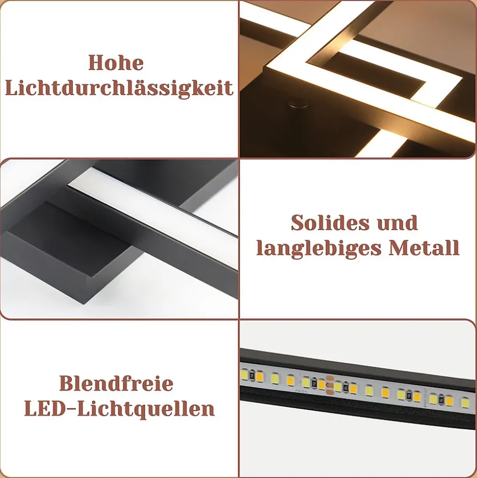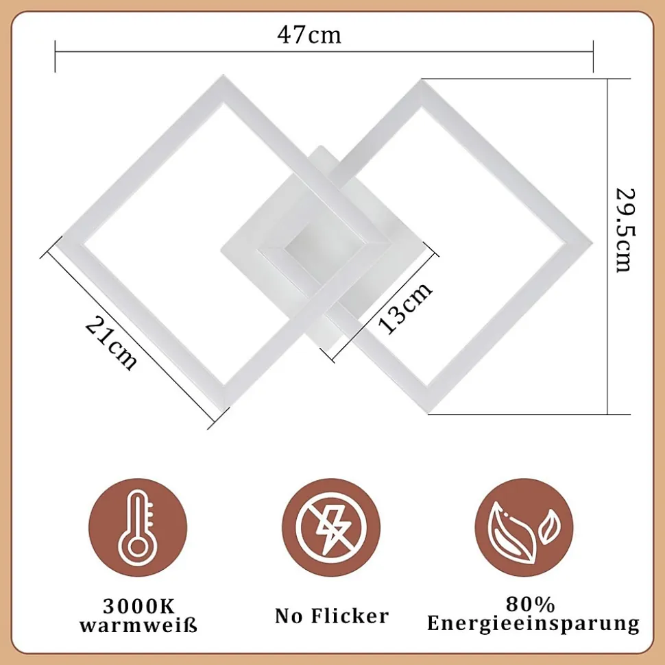【Conception rotative】 Le plafonnier LED décoratif est en métal et comporte deux éléments lumineux carrés et des caches LED en aluminium de haute qualité. Le design moderne s’intègre parfaitement dans la tendance actuelle. L’un des éléments lumineux LED carrés est réglable et vous permet d’en personnaliser l’apparence. Vous pouvez ajuster librement l’angle selon vos goûts personnels.【Efficacité énergétique et protection des yeux】 Ce plafonnier moderne utilise 85 % d’énergie en moins par rapport aux ampoules traditionnelles et a une durée de vie allant jusqu’à 20 000 heures. Il est économe en énergie . Le plafonnier dispose de sources lumineuses LED stables et non éblouissantes qui garantissent la protection de vos yeux et créent une atmosphère chaleureuse dans votre pièce.【Paramètres du plafonnier】Dimensions : 47 x 29,5 x 6 cm ; Tension : 230 V, puissance : 24 W ; Intensité variable : non ; Température de couleur : 3000 K blanc chaud ; Classe de protection : IP20, longueur côté du carré : 21 cm, longueur côté du plateau de montage au plafond : 13 cm. Le design géométrique crée non seulement un impact visuel parfait, mais augmente également la luminosité de la pièce pour éclairer et décorer idéalement votre intérieur.【Applications polyvalentes et installation facile】 Ce plafonnier LED noir moderne présente une apparence petite et exquise, adapté comme lampe de cuisine, lampe de salle à manger, lampe de couloir, etc. Il est idéal pour les pièces de 5 à 20 mètres carrés, telles que les couloirs. , salons, salles à manger , chambres, cuisines, etc. Le plafonnier LED a un design simple et peut être installé en quelques étapes seulement en connectant le câble et en vissant la lampe au plafond.【Service client de qualité】 Nous offrons une garantie de 2 ans pour cette lampe. Notre service client est tout aussi unique que le design contemporain de nos lampes – une qualité convaincante. Si vous avez des questions, n’hésitez pas à nous contacter.