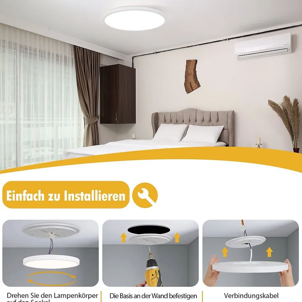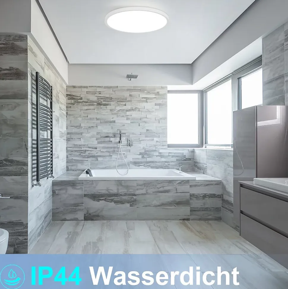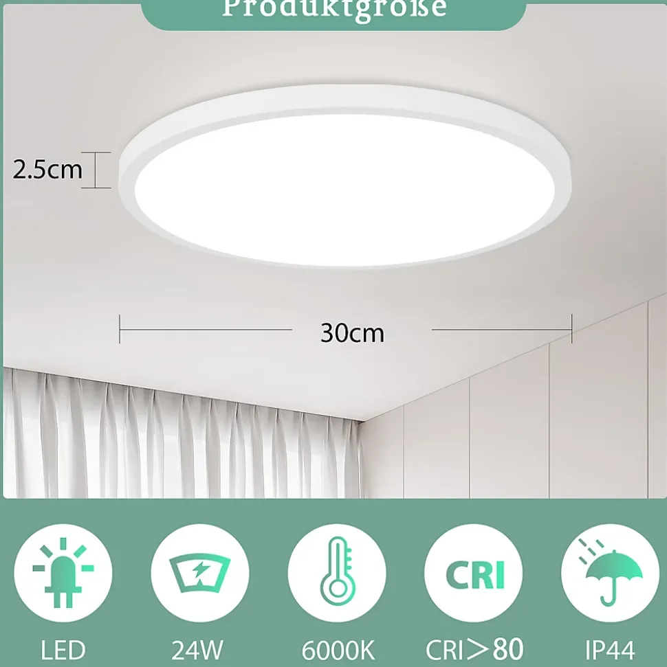 Plat et élégant : ce plafonnier LED de seulement 2,5 cm d’épaisseur séduit par ses lignes ultra fines et minimalistes. Son design épuré et élégant s’intègre parfaitement dans n’importe quelle pièce et lui donne une touche de modernité.Raffinement technique : avec une puissance de 24W, cette lampe de salle de bain de haute qualité remplace facilement une ampoule classique de 150 W et est encore plus économe en énergie. Grâce à sa longévité allant jusqu’à 25 000 heures, il assure un éclairage longue durée à votre maison. Type de lampe : LED ; puissance : 18W ; température de couleur : 6000K ; dimensions : 29,5*29,5*2,5 cm ; matériau : plastique ; tension : 230 V.Conception respectueuse des yeux : l’indice de rendu des couleurs élevé (CRI≥80) assure une perception précise des couleurs, tandis que l’abat-jour semi-transparent assure un éclairage uniforme et doux sans éblouissement ni scintillement. Cela réduit la fatigue oculaire et crée une agréable sensation d’espace.Utilisation polyvalente : avec son certificat de protection contre les éclaboussures IP44, ce plafonnier LED est idéal pour une utilisation dans la salle de bain, sur le balcon et dans la cave à vin. Il protège efficacement contre la poussière et les insectes et convient donc à différentes pièces comme la salle de bain, la chambre, le couloir, la cuisine, la cave, le bureau, la chambre d’enfant ou le salon.【Service client】 Profitez de notre garantie de 2 ans sur cet éclairage, car notre service client est toujours à votre disposition. Nous sommes fiers de vous offrir non seulement un design de lampe moderne, mais également une qualité impressionnante. Si vous avez des questions ou des préoccupations, n’hésitez pas à nous contacter.