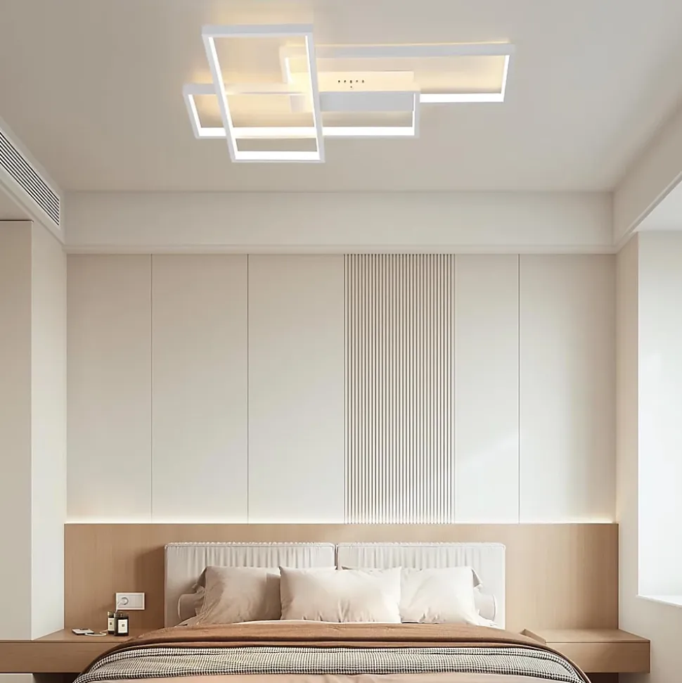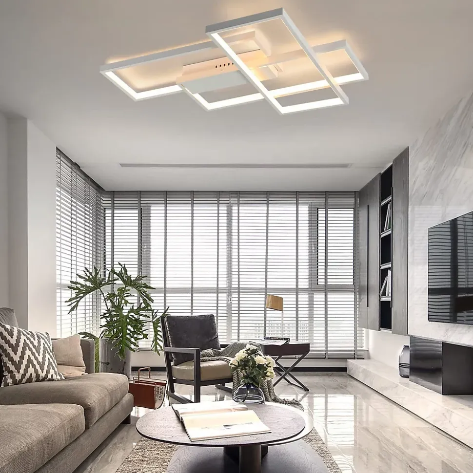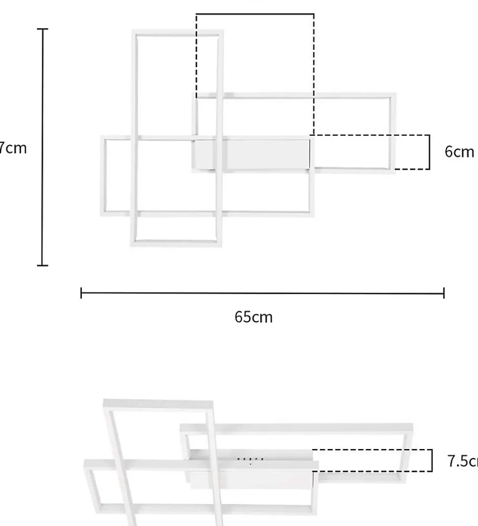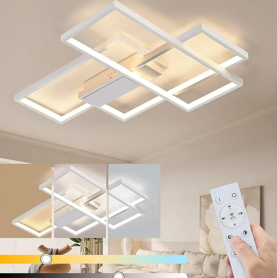 ◆ Design géométrique & minimaliste : le plafonnier est fixé au plafond sur une base parallélépipédique et se compose de trois longs rectangles décalés qui se superposent et sont parallèles les uns aux autres, ce qui garantit qu’une grande zone est éclairée.◆ Plafonnier multifonctionnel : la lampe peut être utilisée non seulement comme plafonnier mais aussi comme applique murale. Elle peut être utilisée dans les salons, les chambres, les couloirs, les balcons, les cuisines, etc. ainsi que dans les espaces commerciaux et d’exposition tels que les restaurants et les galeries, les couloirs, les salles à manger, les bars, les cafés, les halls.◆ Matériaux de haute qualité : l’abat-jour en aluminium de haute qualité et en gel de silice a une transmission lumineuse élevée. La luminosité des LED est particulièrement forte, ce qui permet de bénéficier d’un bon éclairage sur la surface de la table.◆ Dimmable : La télécommande permet de régler la luminosité en continu et également de faire passer la température de couleur du blanc froid au blanc chaud. Cela permet de mieux adapter la luminosité et la température de couleur à vos souhaits et de créer une ambiance en réduisant la luminosité, par exemple.◆ Dimensions : 65x47x7.5cm. Puissance : 65W. Lumen : environ 5200lm. Température de couleur : 3000K-6500K. Type d’ampoule : LED. Tension : 230v. Dimmable : oui. Ampoule remplaçable : non. Garantie d’achat : 24 mois