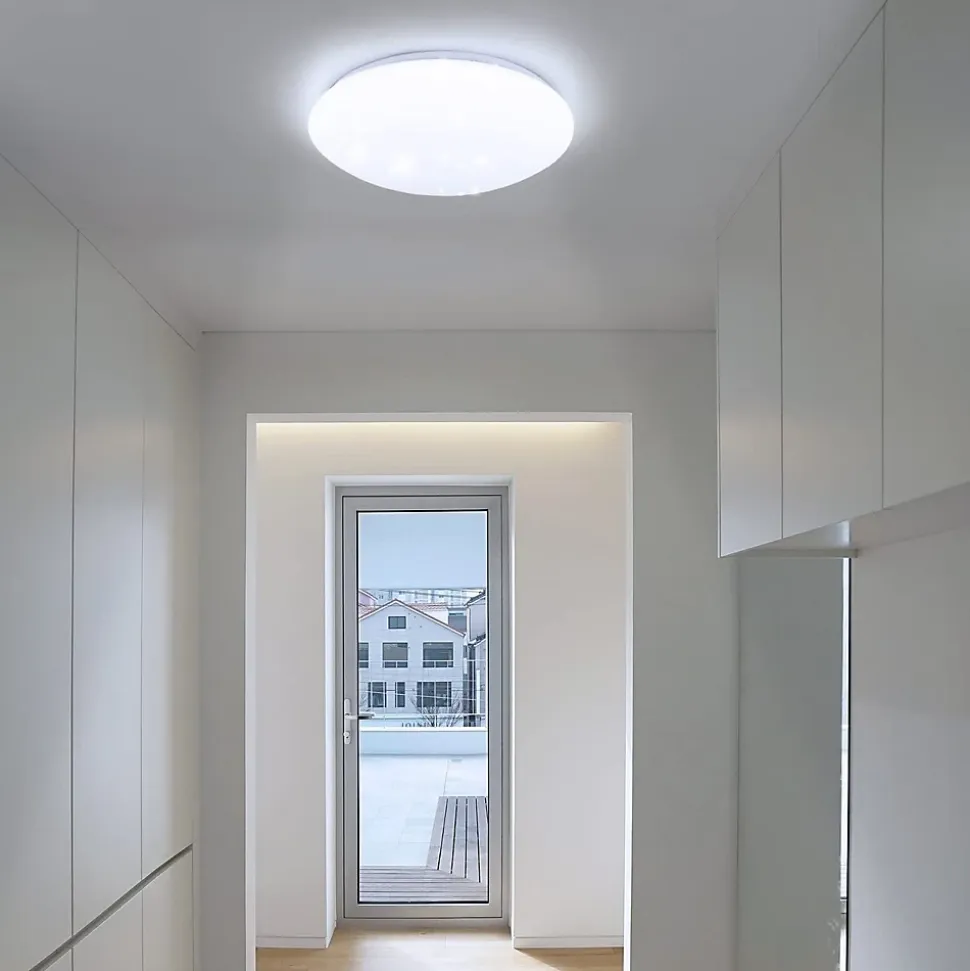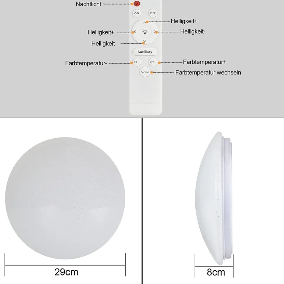 Design ciel étoilé : ce plafonnier LED fabriqué en plastique et fer de haute qualité a un style design élégant et simple qui s’intègre parfaitement au plafond et convient à diverses décorations intérieures. L’abat-jour est composé d’innombrables petits points translucides, à travers lesquels la lumière rayonne sans entrave et donne à l’ensemble de l’abat-jour l’apparence d’un ciel étoilé unique.Technologie CCT dimmable : La technologie CCT vous permet de choisir la bonne couleur de lumière entre les couleurs de lumière allant du blanc chaud, blanc neutre au blanc froid (3000 K à 6000 K), en fonction de vos besoins. Et c’est très confortable avec une télécommande incluse dans la livraison. Ainsi, vous pouvez non seulement sélectionner la couleur de lumière souhaitée, mais chaque couleur de lumière sélectionnée peut également être atténuée en continu.Détails techniques : dimensions : 28 x 28 x 4 cm ; tension : 230 V ; puissance : 37 W ; dimmable : oui ; classe de protection : IP20 ; matériau : métal et plastique ; les ampoules LED sont fermement installées, grâce à la technologie LED, une bonne efficacité énergétique peut être garantie. La durée de vie est de 25 000 heures.Applications multiples : ce plafonnier décoratif ciel étoilé de 37 W convient non seulement pour le couloir, la cuisine, la salle à manger, le salon, mais aussi pour les espaces de loisirs tels que la chambre à coucher et le bureau de la chambre d’enfant. Ainsi, chaque pièce est complétée par un accessoire lumineux très spécial.Service client : nous offrons une garantie d’achat de 2 ans pour l’éclairage, le produit a été récemment révisé et modernisé et il existe des cas où les valeurs d’efficacité énergétique ne correspondent pas à la page détaillée. Si vous recevez le produit et rencontrez des problèmes, veuillez contacter notre service client.