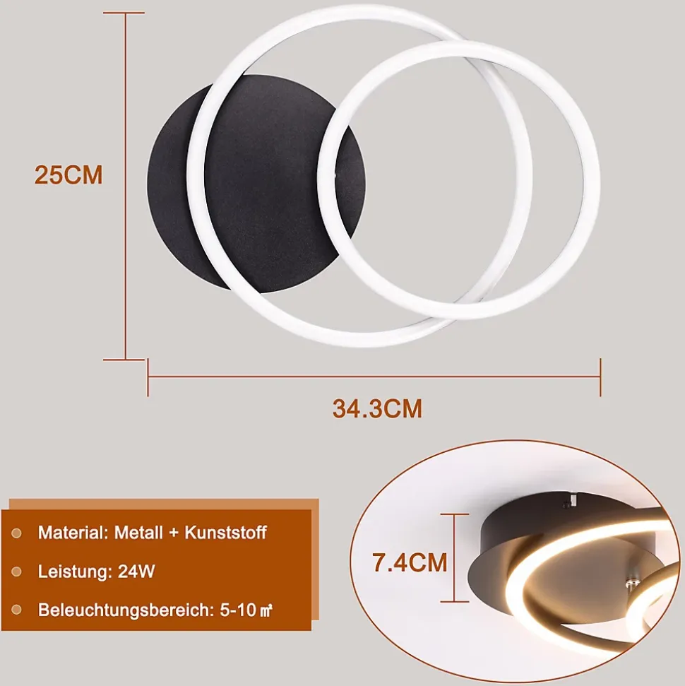 Design moderne : le design noir élégant et le corps rond élancé font de ce plafonnier un ajout élégant à tout intérieur contemporain. La lumière douce et le corps rond créent une atmosphère élégante et confortable dans votre chambre à coucher.Matériau métallique : le plafonnier est composé de fer, d’aluminium et de plastique. Il dispose d’une forte dissipation de chaleur, d’une température de fonctionnement stable de la source lumineuse, il est robuste et durable et est résistant à la corrosion et à la rouille.Paramètres du produit – Taille : 34.3*25*7.4 CM ; Puissance : 24 W ; Couleur : noir/blanc ; Tension : 220-240VAC ; Matériau : fer+aluminium+plastique ; Température de couleur : 3000 K, lumière blanche chaude ; Zone d’éclairage : 8-15M².Large champ d’application : Plafonnier LED avec tous les accessoires d’installation, pas de procédures compliquées, très bien adapté à l’éclairage intérieur, recommandé pour l’installation dans le salon, la chambre à coucher, la salle à manger, la cuisine, le couloir, etc.