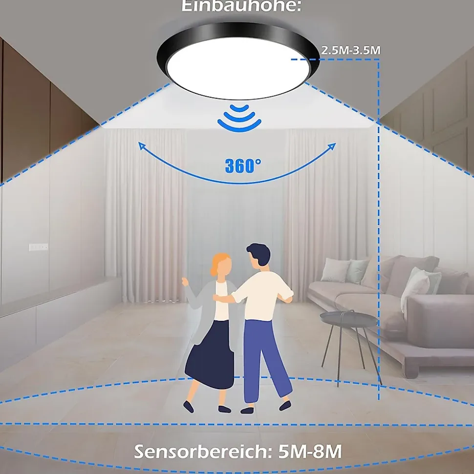 Conception avec détecteur de mouvementCe plafonnier est équipé d’un capteur intelligent qui détecte automatiquement l’activité humaine pour allumer et éteindre la lumière. Cette fonction simplifie l’utilisation, économise de l’énergie et prolonge la durée de vie de la lampe.Indice d’étanchéité IP44Certifié IP44, ce plafonnier est adapté aux environnements humides comme les salles de bains, les couloirs et les cages d’escalier. Il résiste au brouillard et à l’humidité, assurant ainsi un fonctionnement stable et une sécurité optimale.Facile à installerL’installation est simple et intuitive grâce aux instructions détaillées fournies. Vous pouvez l’installer vous-même sans besoin d’un professionnel. Suivez les étapes du manuel pour une installation rapide et sans complication.Sans scintillement et sans éblouissementDoté de la technologie LED sans stroboscope, ce plafonnier réduit efficacement les effets stroboscopiques qui peuvent causer fatigue et irritation oculaires. Il offre ainsi un éclairage stable et confortable tout en étant économe en énergie.Indice de rendu des couleurs élevéCe plafonnier offre une lumière blanche neutre de 4000K, mettant en valeur les détails et les vraies couleurs d’une pièce. Il crée un environnement lumineux confortable et agréable, idéal pour les salles de bain, couloirs, garages et studios.