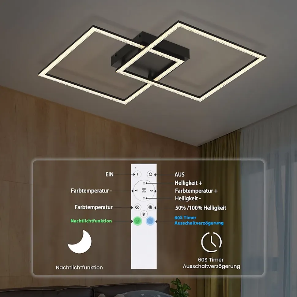 Design géométrique : ce plafonnier LED moderne apporte une solution d’éclairage chic et sophistiquée à votre intérieur avec son design géométrique unique en bande de cristal. Ce design offre non seulement un look élégant, mais également un effet d’éclairage plus doux qui crée une ambiance chaleureuse et moderne dans votre pièce.Télécommande : profitez d’une expérience d’éclairage simple et intelligente avec un contrôle précis de la luminosité et de la température de couleur via la télécommande. Avec une large gamme de températures de couleur, de la lumière blanche chaude à 3 000 K à la lumière blanche froide à 6 500 K, et une luminosité réglable, vous pouvez obtenir l’effet d’éclairage idéal pour différentes occasions et moments, de clair à chaud, comme vous le souhaitez.Fonction minuterie : l’introduction de la fonction minuterie intelligente, qui s’éteint automatiquement après une minute, permet non seulement d’économiser de l’électricité, mais vous donne également un sentiment de sécurité. Cette fonction garantit que vous n’aurez pas à vous soucier d’oublier d’éteindre les lumières et apporte plus de commodité et de confort à votre vie.Détails du plafonnier : La puissance est de 52 W, les dimensions sont de 54 x 54 x 7,5 cm, la tension est de 230 V. Le plafonnier est dimmable et la température de couleur varie de 3000 K à 6500 K. Le plafonnier doté de la technologie LED avancée est énergétique. efficace et un bon choix pour le salon et la chambre