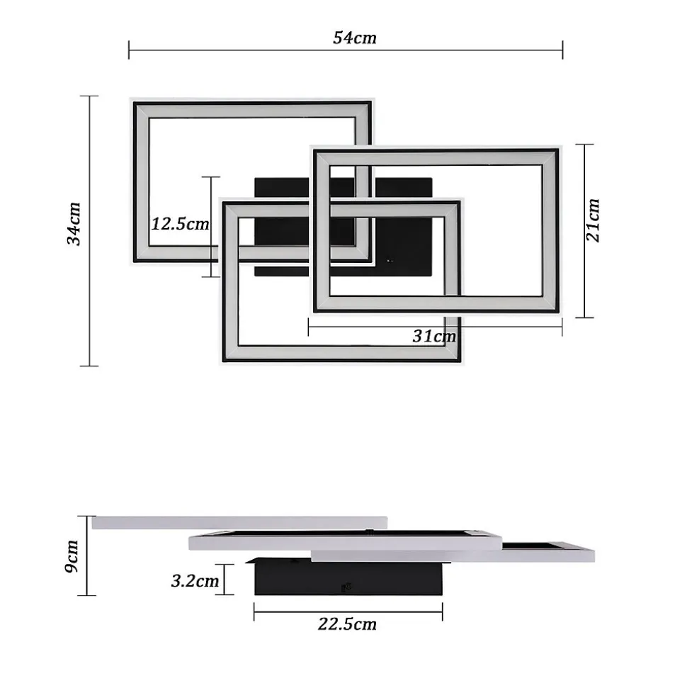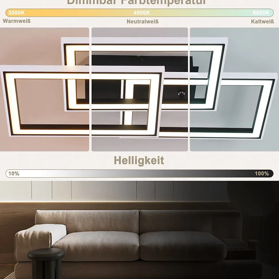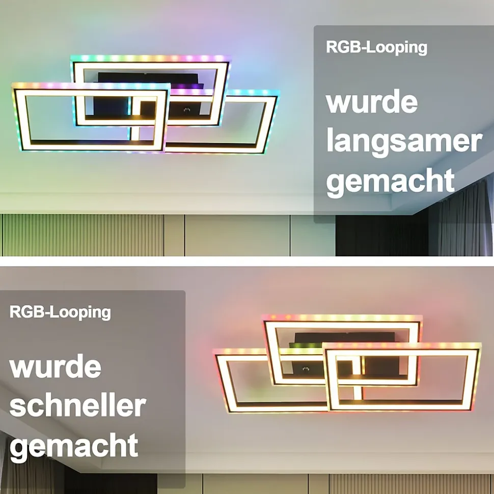 【Design RVB + CCT】 : Ajoutez une touche élégante à votre intérieur avec ce plafonnier LED 45 W de haute qualité et son design géométrique élégant. Utilisez la télécommande pour régler l’éclairage selon vos préférences personnelles. Grâce au matériau avancé de la puce LED, cette lampe est économe en énergie et a une durée de vie allant jusqu’à 25 000 heures. Profitez d’une joie durable grâce à ce plafonnier.【Technologie CCT dimmable】Grâce à la technologie CCT, vous pouvez choisir entre les couleurs de lumière blanc chaud, blanc neutre et blanc froid (3000K à 6000K) avec ce plafonnier et ainsi choisir la couleur de lumière parfaite pour vos besoins. Profitez de réglages d’éclairage confortables selon vos souhaits.【Mode RVB】 : le plafonnier LED à intensité variable offre une variété de modes d’éclairage. Choisissez parmi 13 couleurs ou activez le mode cycle pour un changement de couleur continu. Avec la télécommande, vous pouvez arrêter, démarrer, accélérer ou ralentir l’anneau lumineux pour créer l’atmosphère que vous souhaitez. Ce plafonnier LED permet des réglages d’éclairage polyvalents.【Détails techniques】 Taille totale : 54*34*9 cm ; Tension : 230 V ; Puissance : 45 W ; Intensité variable : oui ; Changement de couleur : oui ; Abat-jour rotatif : oui ; Classe de protection : IP20 ; Matériau : métal et plastique ; Les ampoules LED sont installées de manière permanente et une bonne efficacité énergétique peut être garantie grâce à la technologie LED. La durée de vie est de 25 000 heures.【Service client】 Nous vous offrons une garantie d’achat de 2 ans pour notre éclairage. Notre service client est aussi unique que le design contemporain de nos lampes. Nous attachons une grande importance à la qualité et sommes toujours là pour vous. Si vous avez des questions, n’hésitez pas à nous contacter. Votre satisfaction est notre préoccupation.