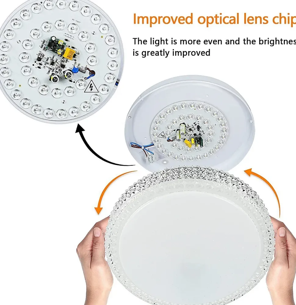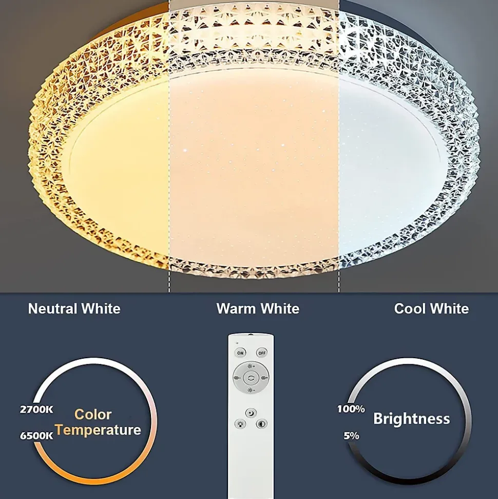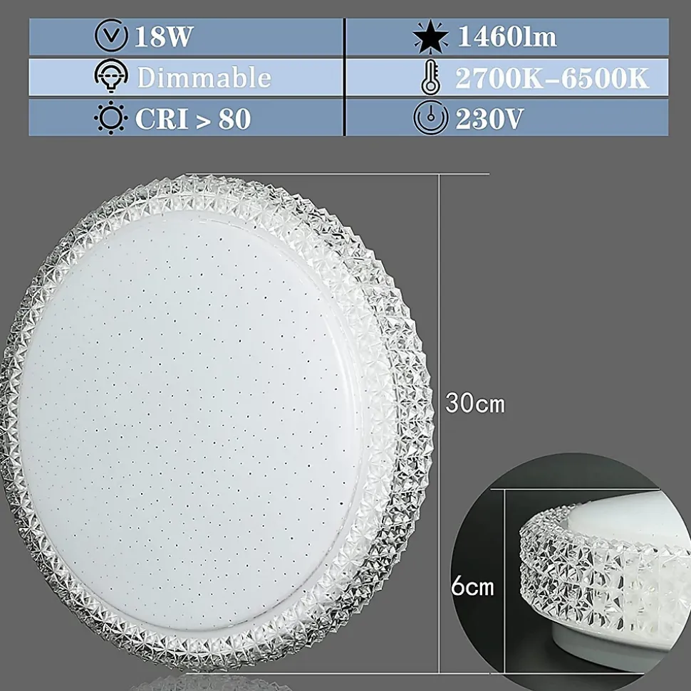 Design créatif : ce plafonnier LED blanc moderne en plastique et métal présente un design élégant qui reflète le ciel étoilé. Le cristal transparent sur le bord rehausse le design du plafonnier. Fonctionnalité et esthétique forment une unité parfaite dans cette lumière.Technologie CCT dimmable : La technologie CCT vous permet de choisir la bonne couleur de lumière entre les couleurs de lumière allant du blanc chaud, blanc neutre au blanc froid (2700 K à 6500 K), en fonction de vos besoins. Et c’est très confortable avec une télécommande incluse dans la livraison.Détails techniques : dimensions : 30 x 30 x 6 cm, tension : 230 V, puissance : 18 W. Les ampoules LED sont installées de manière fixe, grâce à la technologie LED, une bonne efficacité énergétique peut être garantie. La durée de vie est de 25 000 heures.Applications multiples : ce plafonnier décoratif en forme d’étoile blanche de 18 W avec cristaux convient non seulement pour le couloir, la cuisine, la salle à manger, le salon, mais aussi pour les pièces de loisirs telles que les chambres et les chambres d’enfants.Service client : nous offrons une garantie d’achat de 2 ans pour l’éclairage, le produit a été récemment révisé et modernisé et il existe des cas où les valeurs d’efficacité énergétique ne correspondent pas à la page détaillée. Si vous recevez le produit et rencontrez des problèmes, veuillez contacter notre service client.