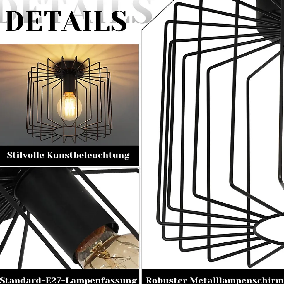 Plafonnier de style vintage : Le design vintage en métal avec sa structure métallique simple et précise attire tous les regards. Ce plafonnier noir allie harmonieusement les styles industriels modernes et rétro. L’abat-jour ouvert crée un jeu fascinant d’ombre et de lumière au plafond, créant une atmosphère accueillanteDouille E27 standard : Ce plafonnier rétro est compatible avec diverses douilles E27. Puissance nominale : Max.40W. Tension : 220 V-240 V. Ce plafonnier peut être utilisé avec différents types d’ampoules, notamment des ampoules halogènes, LED, CFL et à incandescence, qui peuvent toutes créer un effet d’éclairage attrayant. Attention : l’ampoule n’est pas incluseAbat-jour en métal noir : Ce plafonnier vintage élégant comprend un abat-jour en métal d’un diamètre de 27 cm, d’une hauteur : 20 cm et d’une douille standard E27. Diamètre de la base du plafond : 10 cm. Remarque : le diamètre d’ouverture de l’abat-jour est d’environ 9 cm, veuillez vérifier la taille avant d’acheter l’ampouleUtilisation polyvalente : le design intemporel et minimaliste fait de ce plafonnier E27 un véritable accroche-regard dans n’importe quelle pièce. Il est idéal pour éclairer et décorer les couloirs, les salles d’étude, les salons, les bureaux, les porches, les garages, les chambres, les cuisines, les bars, les cafés, les magasins, les restaurants, les balcons et bien d’autres espaces.Installation facile et service client professionnel : notre lustre vintage est livré avec tout le matériel de montage et des instructions détaillées afin que vous puissiez l’assembler sans effort. Nous attachons également une grande importance à un excellent service client. Si vous avez des questions sur le plafonnier, nous sommes disponibles à tout moment et serons heureux de vous aider à résoudre tout problème.