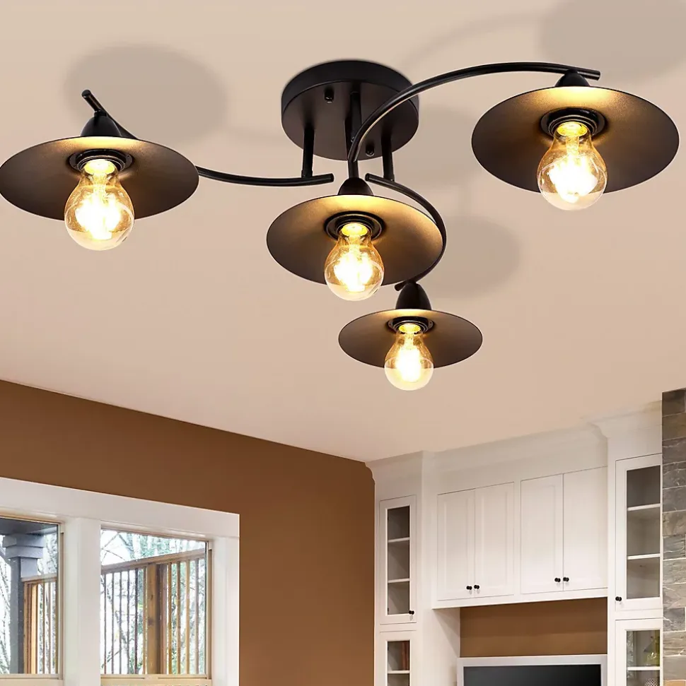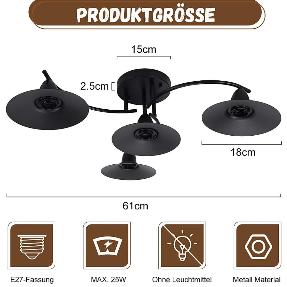 Design élégant et unique : avec un cadre de forme intéressante, composé de trois bras arqués, qui non seulement est élégant, mais donne également au plafonnier un aspect un peu plus rustique ; elle est composée de quatre lampes et fournit donc une lumière suffisamment vive pour de nombreuses pièces du salonDouille E27 et matériau sûr : ce plafonnier noir offre une douille E27 et s’adapte aux ampoules E27 normales (Max.25W). Le fait que la lumière soit dimmable dépend de l’ampoule (ampoule non incluse). Cette lampe est fabriquée en polypropylène, inodore, insipide et présente une résistance à la chaleur et une durabilité élevées.Installation facile : vous pouvez facilement assembler le plafonnier selon les instructions et l’opération simple ne prend qu’environ 10 minutes. 3 minutes. Le plafonnier à 4 flammes est léger et peut être installé par vous-même. Si vous avez des questions, veuillez nous contacter, nous vous soutiendrons professionnellementPlafonnier multifonctionnel : peut être utilisé dans les salons, chambres, couloirs, balcons, cuisines, etc., ainsi que dans les espaces commerciaux et d’exposition tels que restaurants et galeries, allées, salles à manger, bar, café, hall.Service client: garantie de 24 mois, support technique par message 24 heures, garantie de remboursement de 60 jours en cas de problème de qualité ; Notre objectif est 100% de satisfaction client. Si vous avez des questions, veuillez nous contacter et nous serons heureux de vous aider