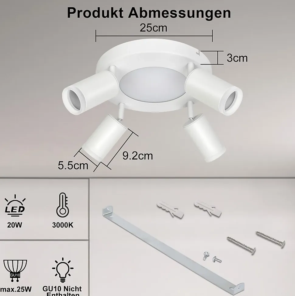 [Haute qualité et économie d’énergie] Le plafonnier LED offre une couleur de lumière blanche chaude de 3 000 K, ce qui peut fournir à votre pièce une lumière blanche chaude suffisamment brillante et uniforme. Et la lampe de chambre de 20 W peut parfaitement remplacer la lampe à incandescence traditionnelle, qui est très économe en énergie. Nos spots sont fabriqués à partir de matériaux de qualité robustes et durables (métal et acrylique), qui sont non seulement durables mais empêchent également la rouille et la saleté.[Design et personnalisation] Avec son design moderne et simple, notre lampe de salle à manger s’adapte à tous les styles de vie. Le spot est équipé sans ampoules, vous pouvez donc choisir librement entre différentes lampes GU10.[Protection des yeux] La lampe de chambre fournit une lumière vive et naturelle, nous permettant de percevoir avec précision les couleurs originales des objets. Le spot de plafond ne scintille pas pour réduire la fatigue oculaire et offrir à vous et à votre famille un environnement lumineux sain et confortable.[Flexible et innovant] Avec des options de mouvement vertical à 90° et de mouvement horizontal à 350°, vous pouvez positionner l’applique murale comme vous le souhaitez. Lampe de salle de bain Disponible en finition mate ainsi qu’en noir et blanc pour s’adapter à n’importe quel décor.[Polyvalence] Le plafonnier LED peut facilement être utilisé dans la salle de bain, le balcon et la cave à vin, la chambre, le couloir, la cuisine, la cave, le bureau, la chambre d’enfant ou le salon. Le matériau de protection efficace des spots de plafond empêche la poussière et les insectes de pénétrer dans la lampe.: