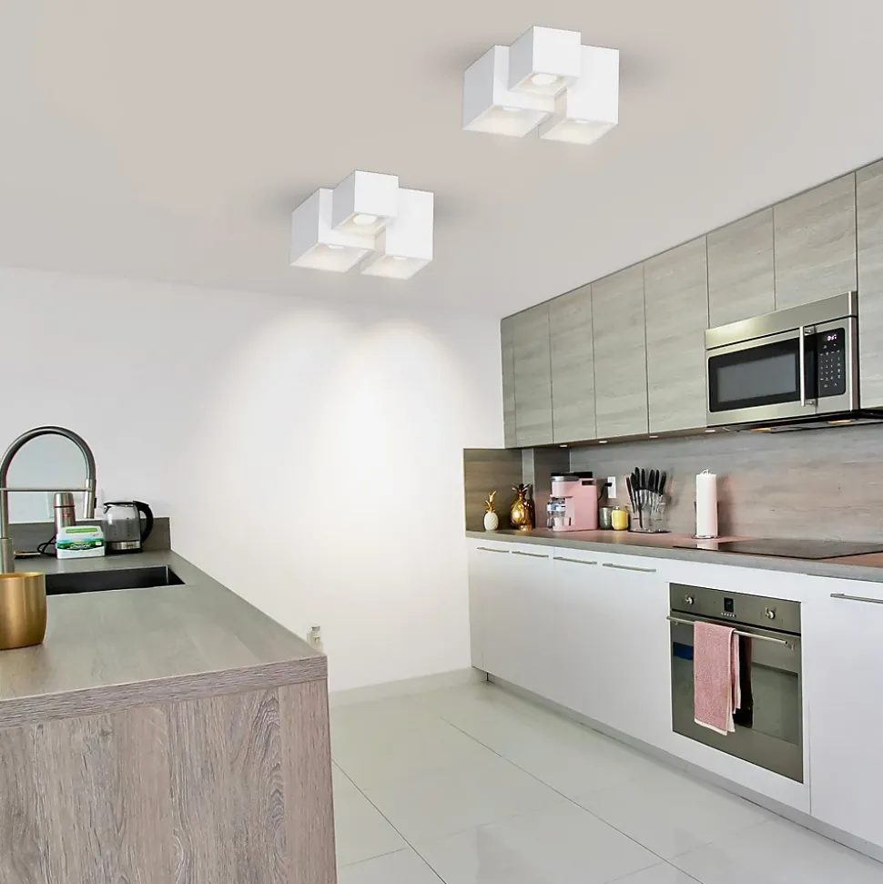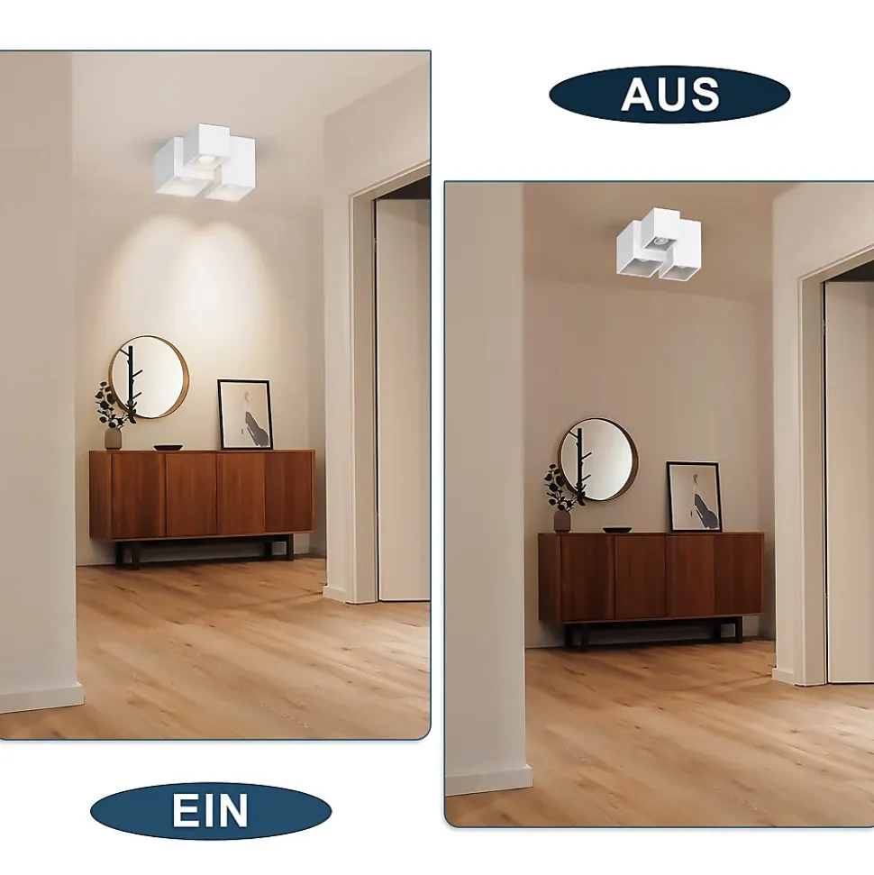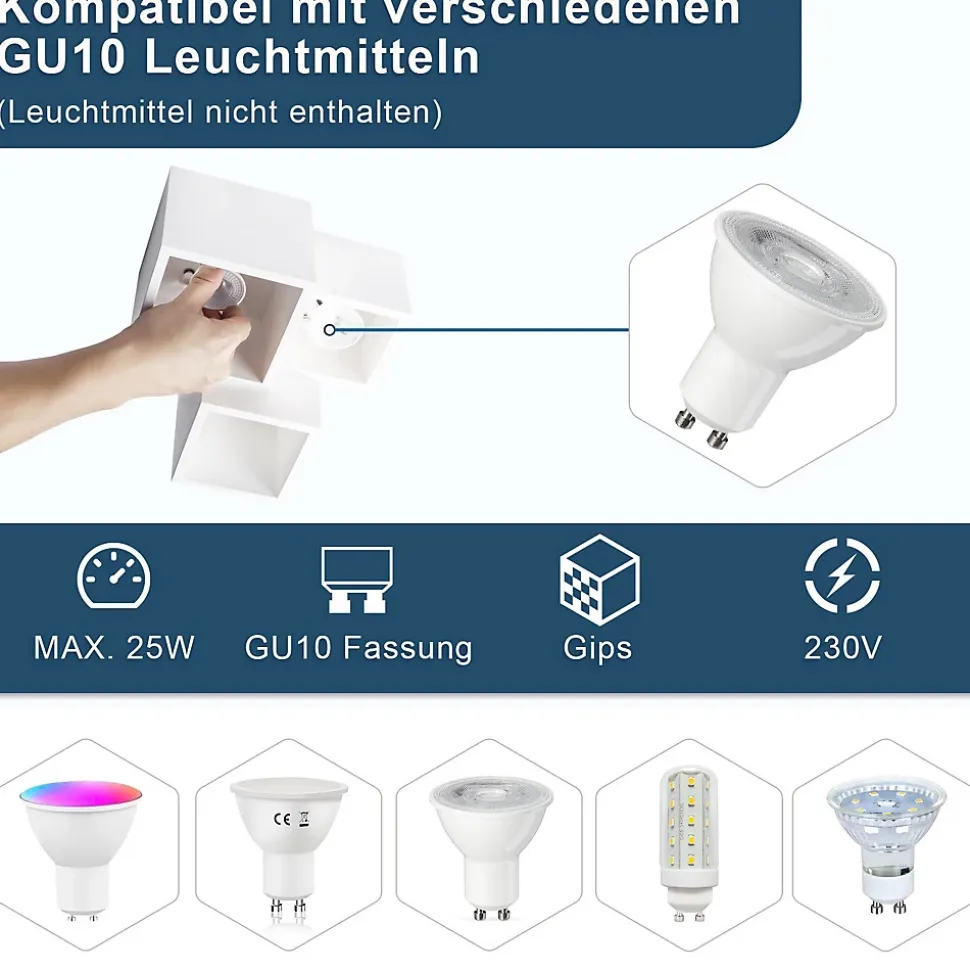 Matériau robuste et durable : Le luminaire en saillie est en plâtre, un matériau résistant aux propriétés exceptionnelles. Il est robuste et particulièrement durable car résistant à la corrosion et insensible aux intempéries. Cela rend cette lampe parfaite pour une utilisation dans le salonDonnées techniques : Le spot a une tension de connexion de 230 volts et une fréquence de 50 Hz. Avec trois points de combustion et une puissance maximale de 3 x 40 watts, le spot est parfait pour éclairer votre maison de manière optimale. Le support de lampe est GU10.Design compact : Le petit plafonnier mesure 230 mm de longueur, 153 mm de hauteur et 153 mm de largeur. Cela le rend extrêmement compact et discret, de sorte qu’il peut s’intégrer parfaitement dans n’importe quelle pièce et ne nécessite pas beaucoup d’espace.Facile à installer : Ce plafonnier en saillie est une bonne alternative à un spot encastrable et convient particulièrement aux espaces étroits ; Grâce au branchement 230V, vous n’avez pas besoin de transformateur, il suffit de connecter les câbles et de serrer les vis pour simplifier l’installationÉclairage intérieur moderne pour le couloir, la cuisine ou le salon : ce spot en saillie offre un éclairage intérieur moderne qui peut être utilisé dans de nombreux domaines d’application. Grâce à son design chic et à sa surface blanche, il attire tous les regards.