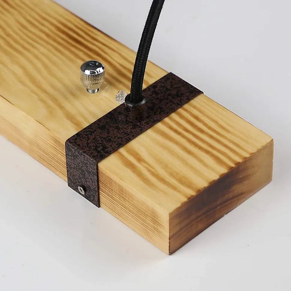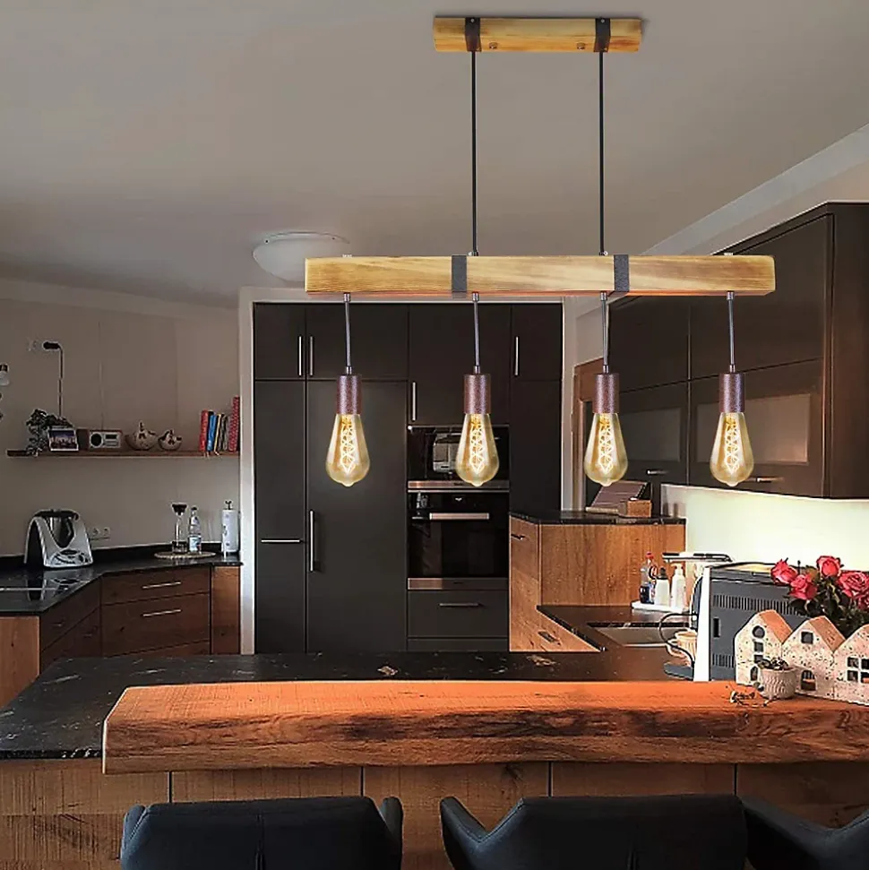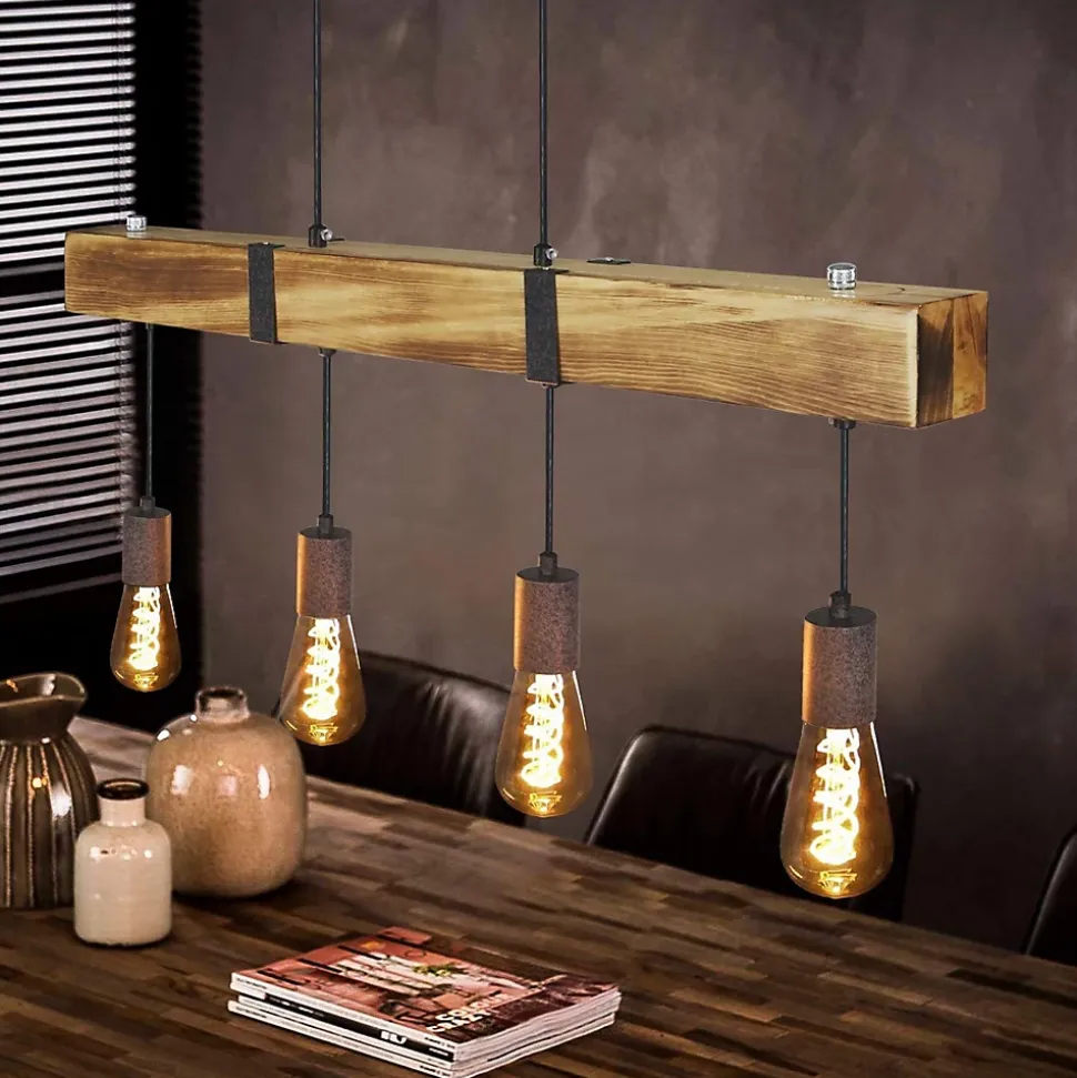 Design rustique & vintage : Cette suspension ancienne se compose d’une poutre en bois de pin suspendue à deux câbles, sur laquelle se trouvent quatre douilles métalliques rétro E27. Il allie charme rustique et style contemporain pour créer une pièce saisissante qui offre la finition parfaite pour un salon ou une salle à manger.Douille E27 : Ce spot de plafond en bois offre une douille E27 et s’adapte aux ampoules E27 normales d’un maximum de 25 watts. Le fait que la lumière soit dimmable dépend de l’ampoule. Attention, cette suspension est livrée sans ampoule. En raison de leurs économies d’énergie et de leur longévité, nous recommandons l’ampoule LED.Détails : Matériau : bois et métal ; Taille de la poutre en bois : 80*6*6 cm ; Taille de la plaque de plafond : 35*8*3 cm ; Câble de suspension : 150 cm ; Prise : E27 (max. 25 W) ; Tension : 230 V ; Type/forme : allongé ; Ampoules incluses : non ; Type de montage : plafond ; En outre : les ampoules peuvent être remplacées150 cm réglable en hauteur de manière flexible : si nécessaire, la hauteur de la lampe de salle à manger en bois peut être réglée jusqu’à un maximum de 150 cm, de sorte qu’il y a suffisamment de place pour un agencement décoratif à différentes hauteurs. Veuillez NOTER : en raison de l’espace limité de la plaque de plafond du plafonnier, si vous devez régler une longueur plus courte (entre 10 cm et 140 cm), vous devez couper le câble. , comme au-dessus d’un bar dans un restaurantVeuillez noter qu’en raison du traitement personnalisé, la technique de combustion du charbon de bois peut varier, ce qui signifie que vous pouvez recevoir des finitions différentes. Le bois, un matériau naturel, peut avoir différentes couleurs et la surface peut être lisse ou rugueuse. Il se peut que vous receviez une lampe dont la texture ne répond pas à vos attentes. Dans ce cas, merci de nous contacter afin que nous puissions organiser un échange pour vous.