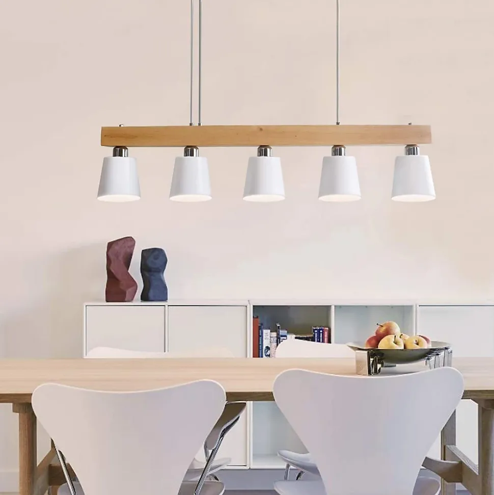 Design : la suspension impressionne par sa combinaison unique d’abat-jour en bois véritable et en métal. La beauté naturelle du bois donne à n’importe quelle pièce une atmosphère chaleureuse, tandis que les abat-jour en métal ajoutent une touche moderne. La lumière brille directement vers le bas, ce qui est parfait pour éclairer de manière optimale une longue table à manger et créer un environnement accueillant.Dimensions : Avec ses dimensions généreuses de 102 x 24 x 13 cm (L x l x H), cette suspension est idéale pour les pièces de taille moyenne à grande. Le câble peut être ajusté jusqu’à une longueur maximale de 150 cm pour permettre un placement flexible sur différentes surfaces. La finition de haute qualité en bois et en métal garantit une durabilité et un aspect élégant. L’installation est simple et simple grâce à une conception bien pensée.Ampoules adaptées : ce produit nécessite cinq ampoules E27 adaptées d’une puissance maximale de 25 watts chacune. Ces ampoules fournissent un éclairage d’ambiance agréable à votre pièce et peuvent être réglées individuellement.Réglage de la hauteur : la suspension peut être ajustée selon vos préférences personnelles dans une longueur de suspension allant jusqu’à 150 cm. Cela vous permet de régler la hauteur de la lampe et ainsi de diriger la lumière de manière optimale vers la zone souhaitée.Application : cette suspension est polyvalente et convient parfaitement aux pièces modernes telles que les bureaux, les salles d’étude, les salles à manger et bien plus encore. Son design moderne lui permet de s’intégrer parfaitement à différents styles d’intérieur et d’ajouter une touche d’élégance à n’importe quelle pièce. Avec une garantie de 2 ans, vous pouvez également compter sur la qualité et la durabilité de ce produit. Avec cette suspension, vous créez non seulement un éclairage agréable, mais aussi une ambiance élégante dans votre maison ou votre bureau.