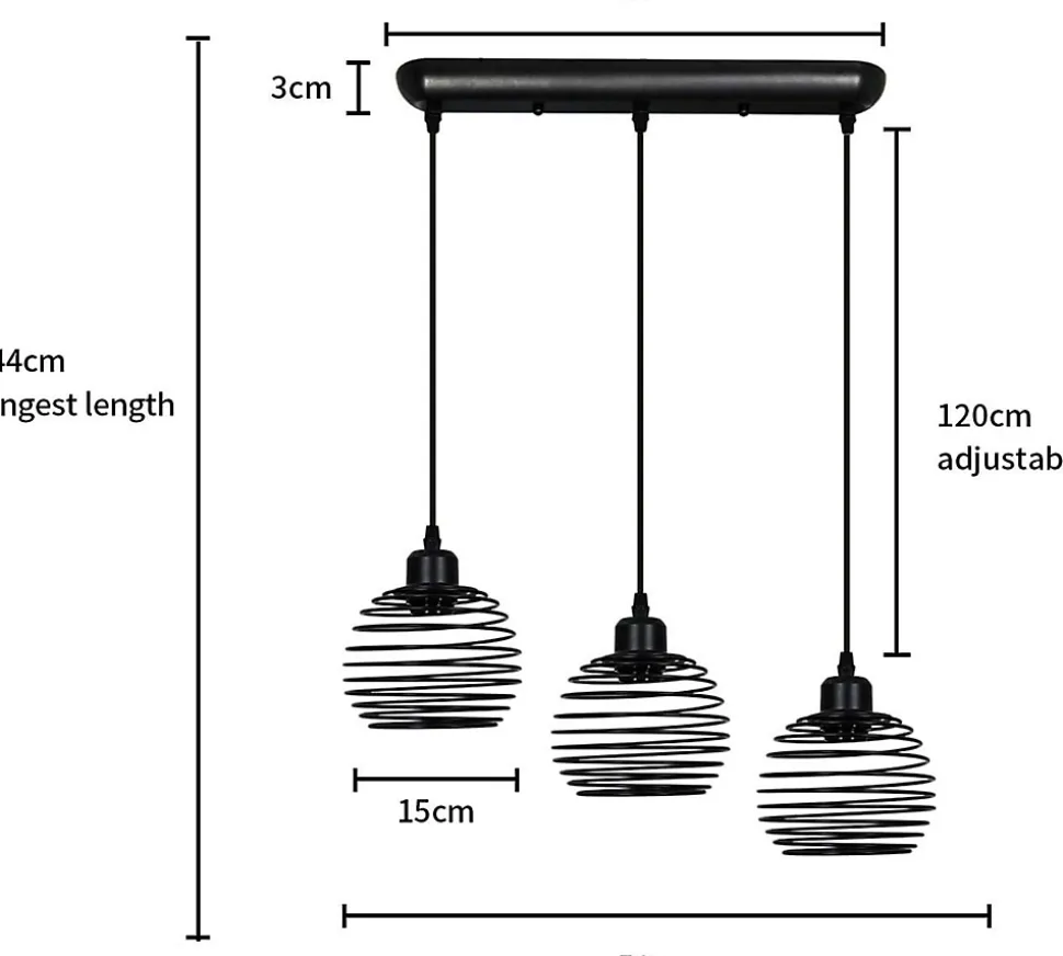 Design rétro : une lampe à suspendre à quatre flammes, idéale pour les chambres d’adolescents, les couloirs et les tables de salle à manger. Les abat-jour sont très différents de leurs homologues stéréotypés et sont surtout très légers et transparents, car ils ont été construits comme une cage sphérique.Détails techniques : Dimensions du produit : env. 50*15*144 CM. Dimensions du socle : env. 43,5*6*3 CM. Ampoule incluse : non. Douille : E27. Puissance maximale de l’ampoule : 25 W. Longueur du câble : 120 CM. Hauteur réglable : oui. Matériau : fer. Raccordement électrique et type de fiche : électrique avec câble. Tension : 230 VDouille E27 standard : la lampe vintage a une douille E27 et convient aux ampoules normales E27 (max. 25 W). Nous recommandons des ampoules claires ou des ampoules rustiques dorées pour compléter le look vintage. PS : l’ampoule n’est pas incluse.Hauteur réglable jusqu’à 120 CM : selon les préférences, la hauteur de chaque luminaire peut être réglée jusqu’à 120 cm ; REMARQUE : en raison de l’espace limité de la plaque de plafond de la suspension, il est nécessaire de raccourcir le câble si une longueur plus courte (entre 10 cm et 110 cm) est souhaitée.Matériaux et installation facile : lampe suspendue en métal noir, fabrication solide dont vous profiterez longtemps. Ce lustre vintage contient les instructions et toutes les pièces de montage pour une installation rapide et facile.