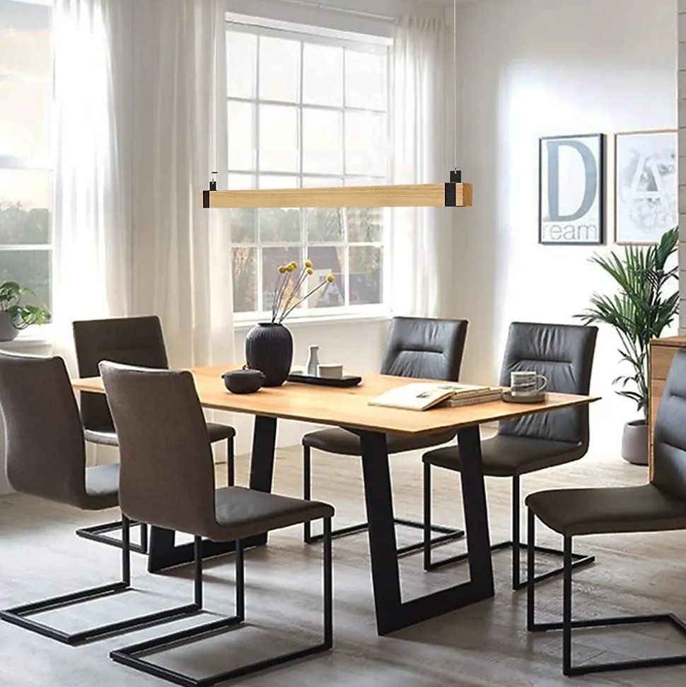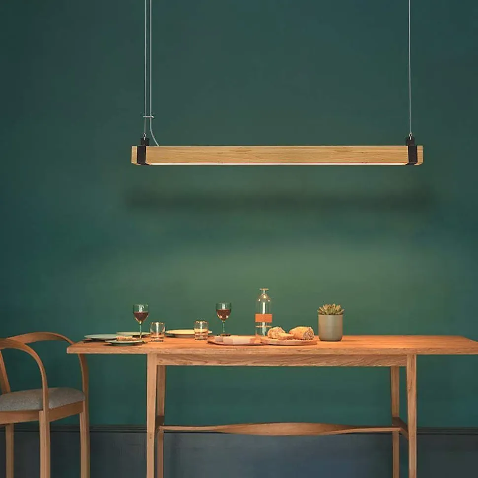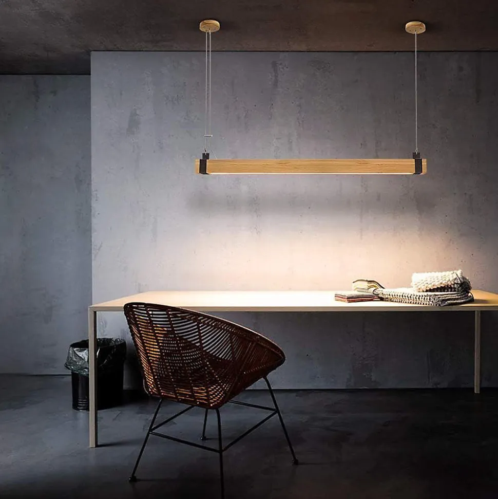 Matériau : cette suspension rétro est une combinaison de bois et de métal de haute qualité, créant un look unique qui aura un réel impact dans n’importe quelle pièce. Qu’il s’agisse d’éclairage pour le salon, la salle à manger, la chambre à coucher, le couloir, le bureau ou la chambre d’enfant, ou même pour les lieux de travail, cette lampe s’intègre parfaitement dans son environnement et confère à chaque pièce une atmosphère particulière.Intensité variable : la suspension en bois est livrée avec une télécommande qui vous permet de modifier en continu la luminosité et la température de couleur – du blanc chaud au blanc neutre en passant par le blanc froid. La fonction de mémoire intégrée mémorise le dernier réglage, vous pouvez donc utiliser la lampe dans le même réglage qu’avant après l’avoir éteinte.Hauteur réglable : La hauteur de la lampe suspendue LED peut être réglée individuellement et en continu. La hauteur maximale est de 150 cm, ce qui la rend particulièrement adaptée à une utilisation au-dessus des tables à manger ou des surfaces de travail. Ce caractère flexible et réglable en fait une solution d’éclairage polyvalente et adaptable.Dimensions : Avec des dimensions de 100*6*9,5 cm, une tension de 230V et une puissance de 19W, cette suspension LED est une option d’éclairage économe en énergie. Les ampoules LED installées en permanence (non remplaçables) garantissent une durée de vie de 30 000 heures et réduisent la consommation d’énergie jusqu’à 85 % par rapport aux ampoules classiques.Service client : nous offrons une garantie vendeur de 2 ans pour cet éclairage, soutenu par nos clients satisfaits et de haute qualité. Notre service client est tout aussi unique que le design contemporain de nos lampes – une qualité qui impressionne. Si vous avez des questions, n’hésitez pas à contacter notre service client.