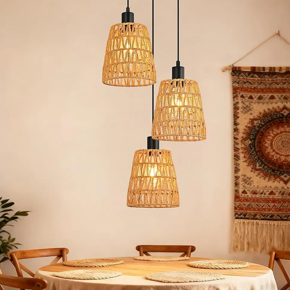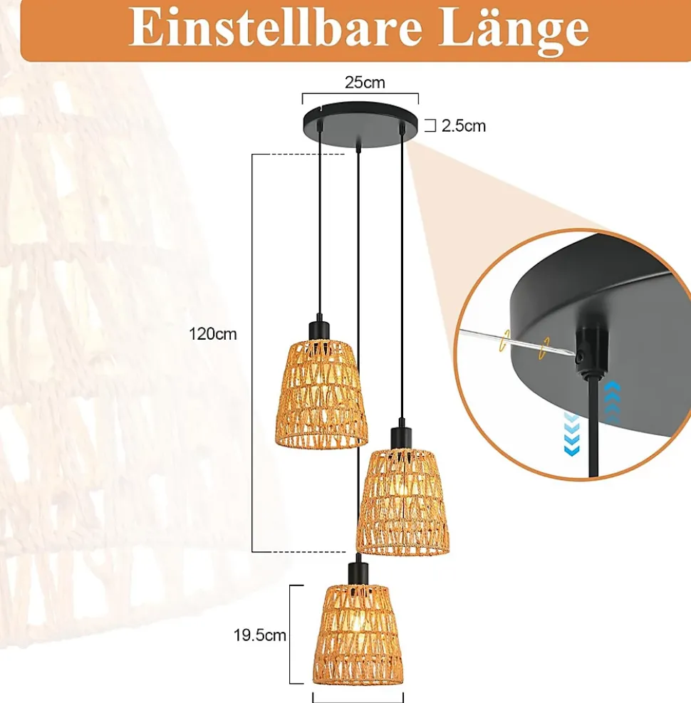 Matériaux de Haute Qualité : Cette suspension vintage est fabriquée en rotin naturel et en métal robuste. L’abat-jour intègre harmonieusement les éléments en rotin. Elle s’adapte parfaitement aux styles maison de campagne, rustique, bohème et rétro, apportant une touche naturelle à votre intérieur.Spécifications du Produit : Ce luminaire mesure 120 x 25 x 25 cm, avec un socle de Ø 25 cm et un abat-jour de Ø 18 cm. Puissance max : 25 W, tension : 220–240 V AC. Le câble est réglable jusqu’à 120 cm pour s’adapter à vos besoins.Douille Standard : Cette suspension de style industriel séduit par son design en cage métallique enveloppée de corde de chanvre. La douille est compatible avec toutes les ampoules E27 (non incluses), telles que les ampoules LED et Edison.Installation Facile : Ce lustre vintage se distingue par sa conception simple. Le câble ajustable permet d’adapter la hauteur à votre plafond. L’installation est rapide grâce aux accessoires fournis ; aucun matériel supplémentaire n’est nécessaire.Polyvalence : Cette suspension en rotin diffuse la lumière vers l’extérieur, créant un charmant effet lumineux. Elle est idéale pour la salle à manger, le salon, le couloir, la chambre, le bureau, l’hôtel, le café ou le bar, créant une atmosphère chaleureuse.