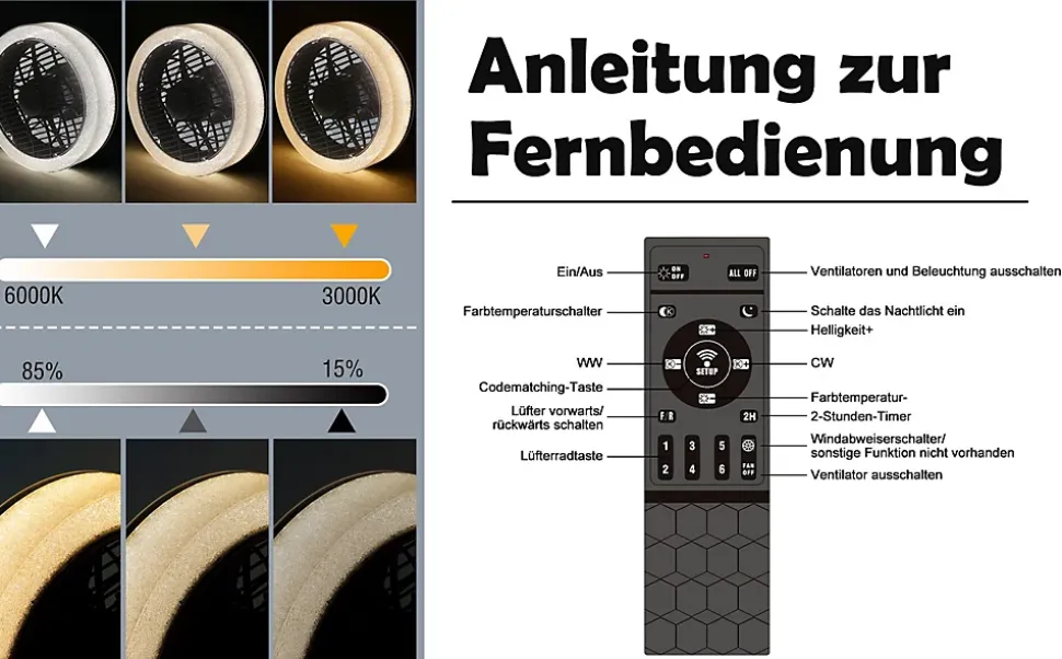 Intensité variable : La luminosité de la lampe ainsi que la lumière blanche froide et blanche chaude (3000K-6000K) peuvent être réglées individuellement à l’aide de la télécommande. Lorsqu’elle est éteinte, la surface reflète la lumière incidente, tandis que lorsque la lumière est allumée, la lumière brille à travers la couche de cristal et lui donne des tons différents, créant ainsi une belle ambiance.Vitesse du vent : La taille est de 18*39,5*39,5 cm, le matériau est en plastique et en métal, alliant légèreté et solidité. La puissance maximale est de 34 W et fournit suffisamment d’éclairage et d’énergie éolienne. La vitesse du vent peut être facilement ajustée via la télécommande, avec un total de 1 à 6 niveaux disponibles pour répondre à différents besoinsContrôle de synchronisation : grâce à la conception spéciale de ce plafonnier à ventilateur, vous pouvez utiliser la télécommande pour régler la durée de fonctionnement du ventilateur selon vos besoins afin de vous protéger du froid la nuit tout en économisant de l’énergie.Faible bruit et économie d’énergie : ce plafonnier ventilateur fonctionne extrêmement silencieusement et ne perturbe pas votre sommeil. Par rapport aux climatiseurs, les ventilateurs lumineux sont économes en énergie , de sorte qu’aucun froid n’est provoqué par des températures trop basses.Applications : ce plafonnier ventilateur est idéal pour les chambres, les salons, les bureaux et les salles d’étude. Il est assorti d’une garantie de 2 ans et si vous avez des questions, notre équipe de service client se fera un plaisir de vous aider.