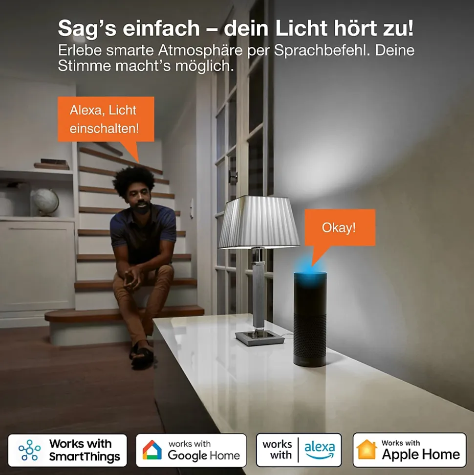 La lampe LED OSRAM SMART+ A60 de 9 W permet des couleurs de lumière flexibles de 2700 à 6500 K grâce à la technologie Tunable White. Contrôlable via application ou commande vocale, compatible avec Matter, dimmable et économe en énergie. Idéal pour les espaces de vie modernes en remplacement des ampoules conventionnelles. La forme classique de l’ampoule s’adapte à de nombreuses douilles E27.