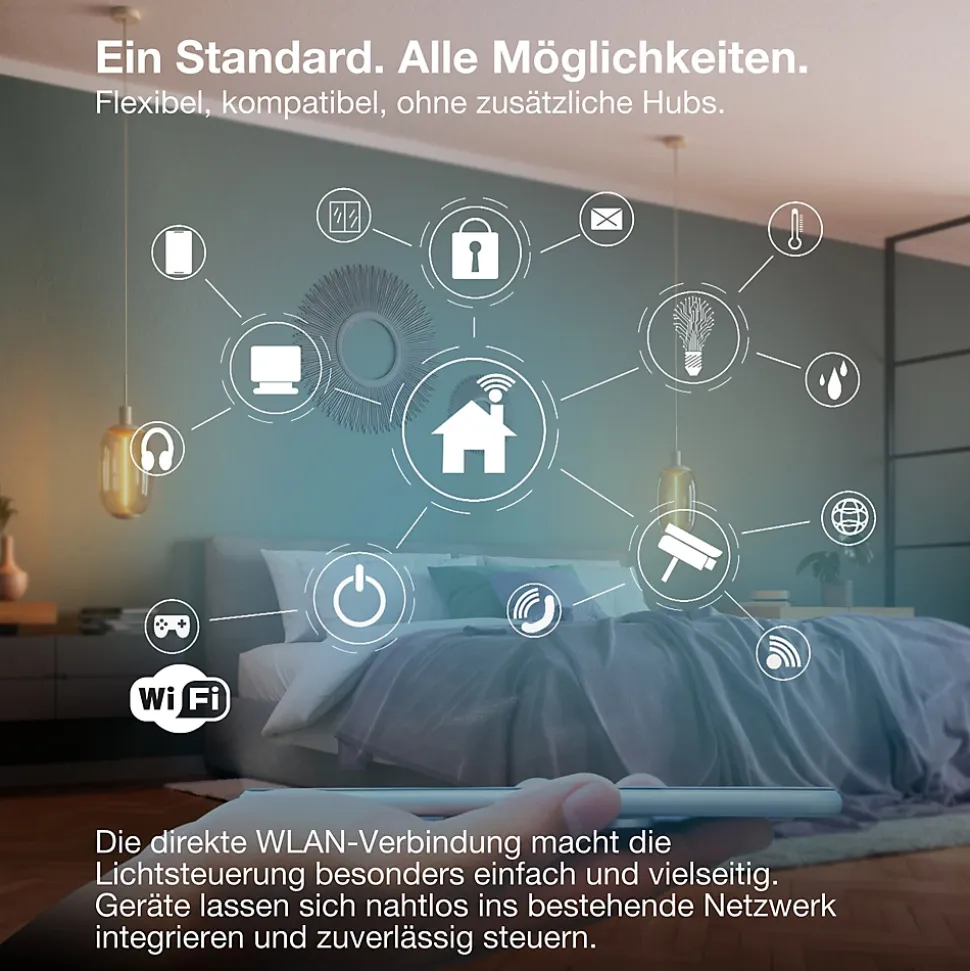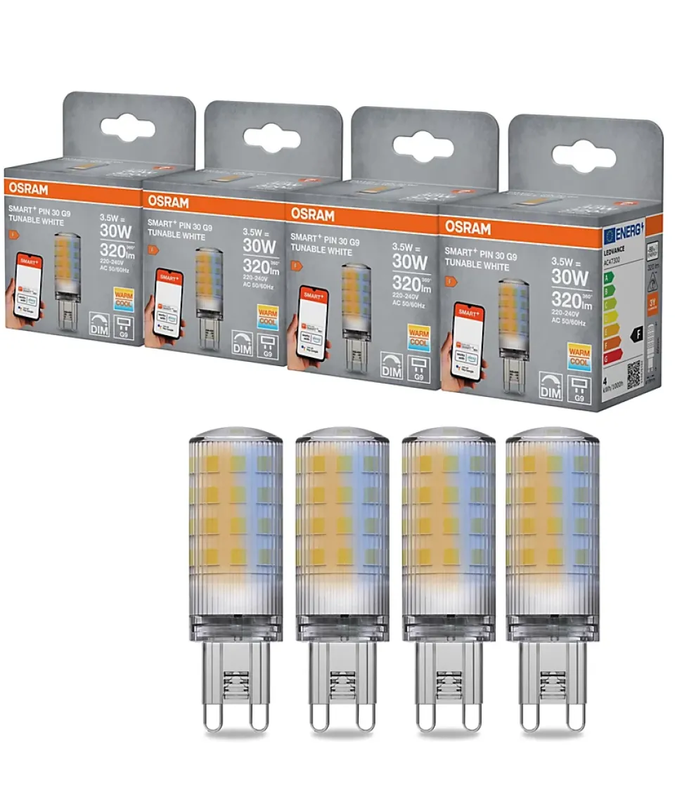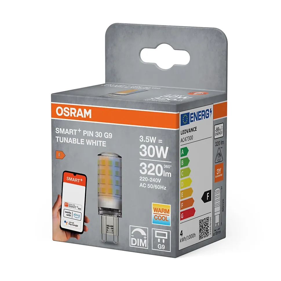 La source lumineuse OSRAM Smart+ WiFi Pin offre un éclairage intelligent pour les zones résidentielles et commerciales avec 3,5 W et version G9. La source lumineuse SMART+ avec contrôle WiFi produit 320 lm avec une température de couleur réglable de 2700 à 6500 K. Le boîtier en plastique transparent mesure 6 cm de longueur et 1,8 cm de diamètre avec une durée de vie allant jusqu’à 20 000 heures.Intégration Smart Home Le contrôle se fait via l’application SMART+ ainsi que Google Assistant ou Amazon Alexa. Le protocole WiFi permet une intégration simple sans pont supplémentaire. La température de couleur peut être ajustée du blanc chaud au blanc froid.Application La lumière convient aux salons ainsi qu’aux hôtels, bars et boutiques. La source lumineuse est sans mercure et économe en énergie.