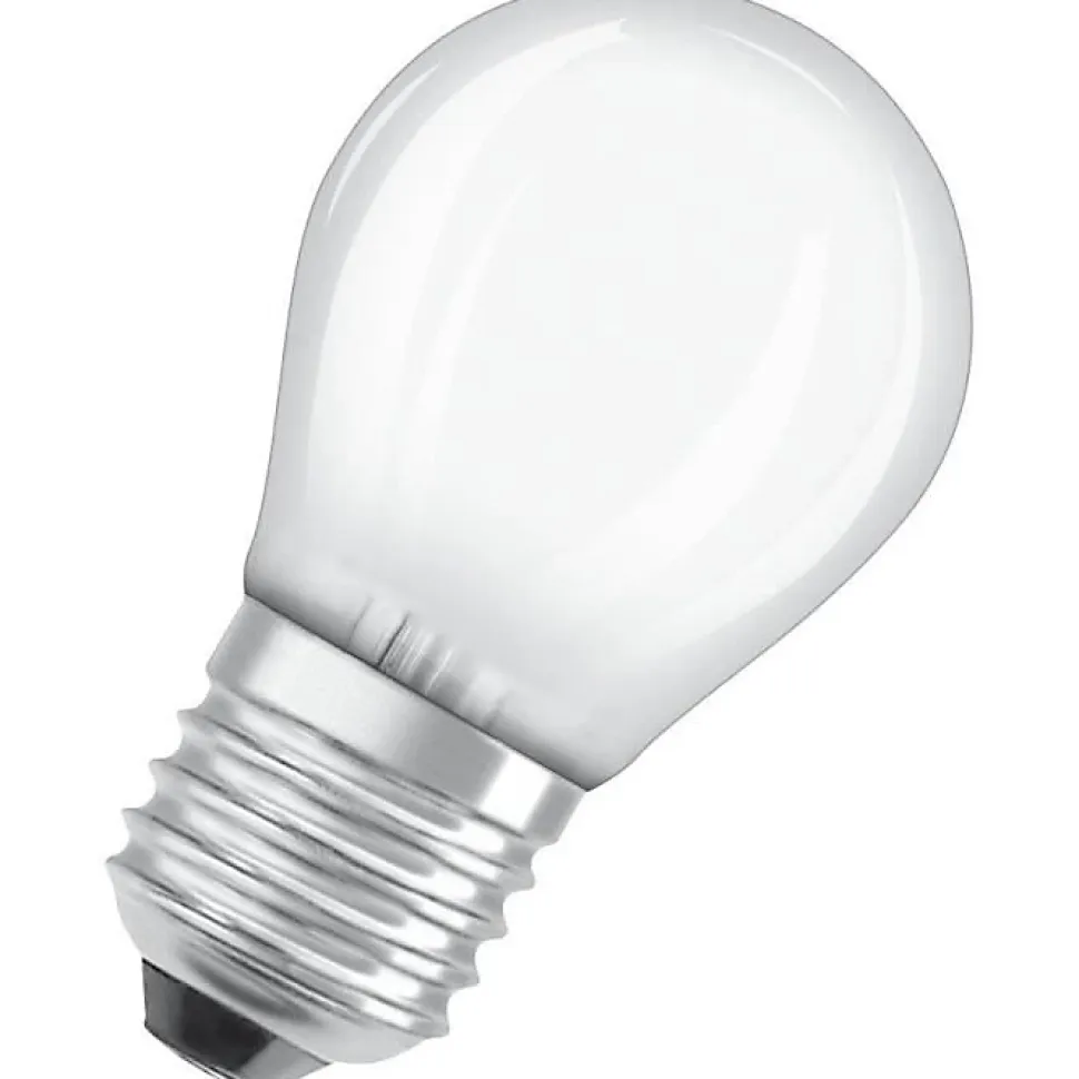 Ampoule LED OSRAM sphérique en verre dépoli 7W 2700K avec culot E27, offrant une lumière chaude et une consommation réduite. Durée de vie 15 000 heures, idéale pour ambiance cosy avec lumière homogène sans éblouissement.