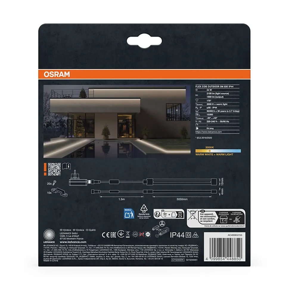 Bandes LED décoratives pour extérieur avec effet lumineux homogène, IP44. Caractéristiques du produit: Technologie COB pour une répartition homogène de la lumière. Couleur de lumière: blanc chaud. Bandes flexibles, pliables LED. Type de protection : IP44. Avantages du produit: Installation facile et rapide. Distribution lumineuse homogène. Eclairage homogène grâce au COB LED . Zones d’application: Applications extérieures. Eclairage indirect. Technique / Accessoires: Accessoires de montage et de connexion complets fournis. Conseils de sécurité: Afin de réduire le risque d’étranglement, le câblage flexible connecté à ce luminaire doit être fixé efficacement au mur si le câblage est à portée de main.. Ne pas brancher le cordon lumineux sur l’alimentation lorsqu’il est enroulé sur une bobine. Ne pas utiliser le ruban lumineux lorsqu’il est recouvert ou encastré dans une surface. Le cordon lumineux ne doit pas être utilisé dans son emballage. Ne pas ouvrir le ruban lumineux.. Vérifiez l’adéquation du mur et du plafond. En cas de doute, demandez conseil à un professionnel..
