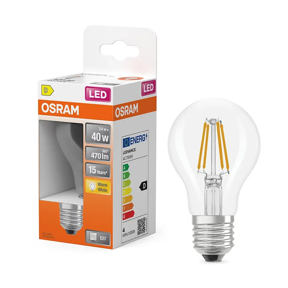 L’ampoule LED OSRAM Star à filament A40 délivre 3,4 watts et 470 lumens dans une couleur blanc chaud de 2700 K pour un éclairage chaleureux. Son culot E27 fiable et sa finition transparente font de cette lampe un excellent compagnon d’ambiance pour les lampadaires. La technologie LED innovante crée instantanément une lumière blanc chaud pour des espaces de vie relaxants.