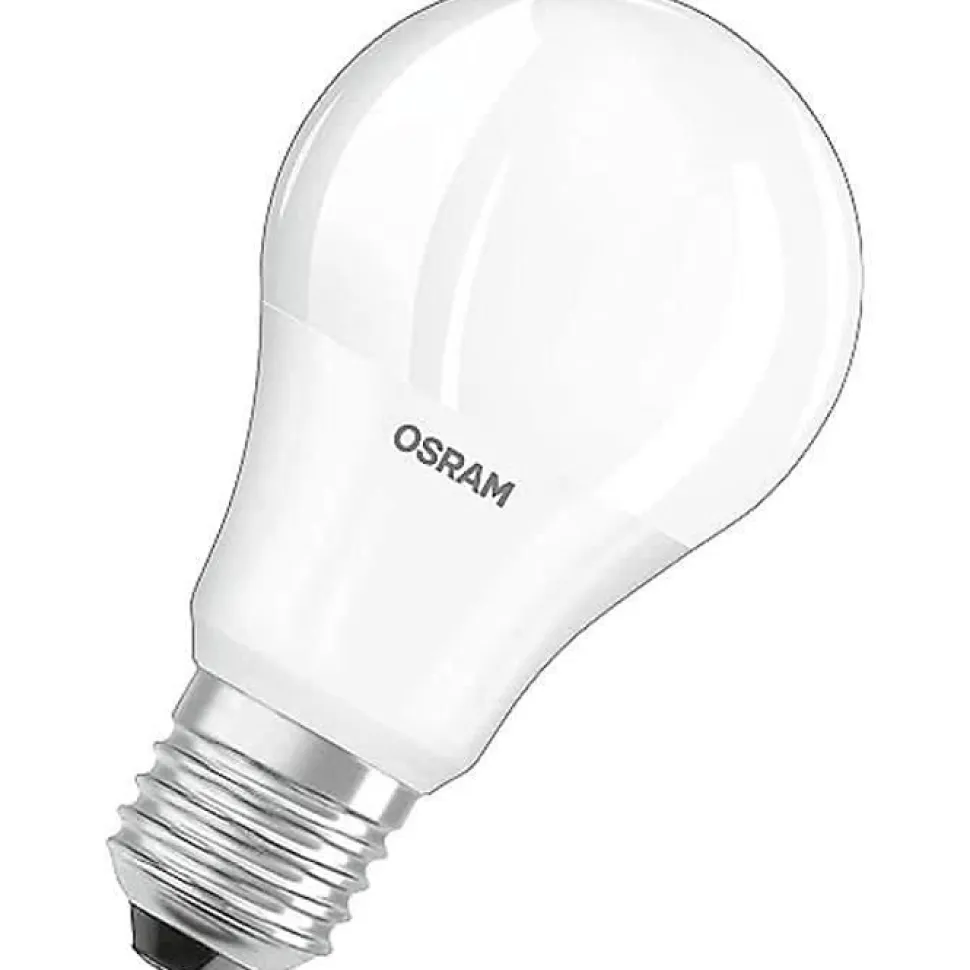 Lot de 5 ampoules LED standard dépolies OSRAM de 9W (équivalent à 60W) avec culot E27. Elles diffusent une lumière blanc chaud et ont une durée de vie de 10 000 heures. Classe énergétique F.