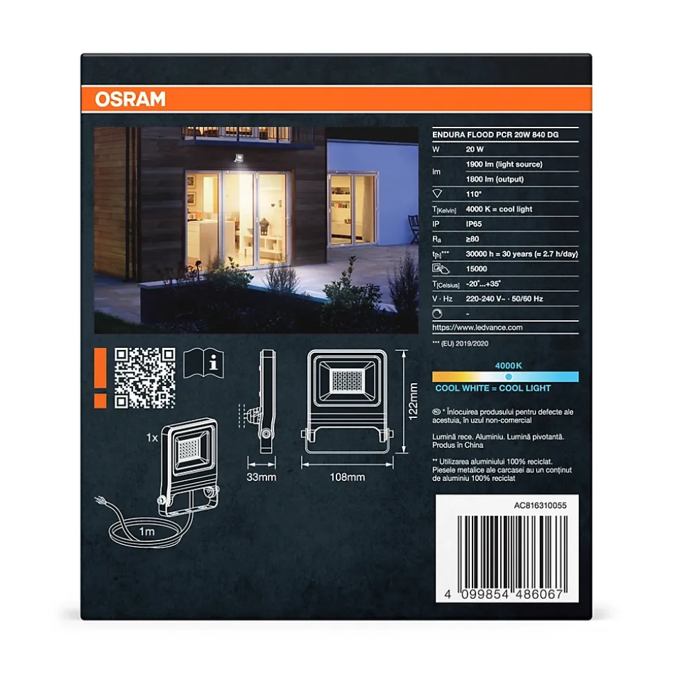 Le projecteur LED OSRAM ENDURA FLOOD PC 20 W offre une puissance impressionnante de 1 800 lumens en blanc froid 4 000 K. Fabriqué en aluminium recyclé durable et doté d’un indice de protection IP65, ce projecteur compact est idéal pour éclairer les espaces de taille moyenne comme les garages. Avec une efficacité allant jusqu’à 100 lm/W, il réduit considérablement les coûts d’électricité. Son support de fixation pivotant à 180° permet un alignement précis.