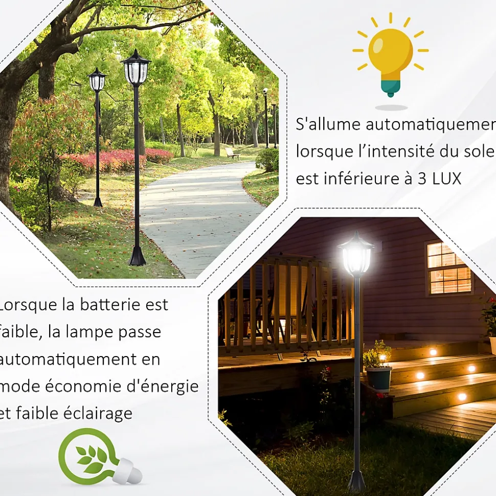 Ce superbe lampadaire LED noir à énergie solaire apportera une touche d’élégance et de romantisme à votre jardin. Doté d’un système interne de gestion de l’éclairage via détecteur de luminosité, il illuminera l’espace de votre choix : bordure de jardin, c