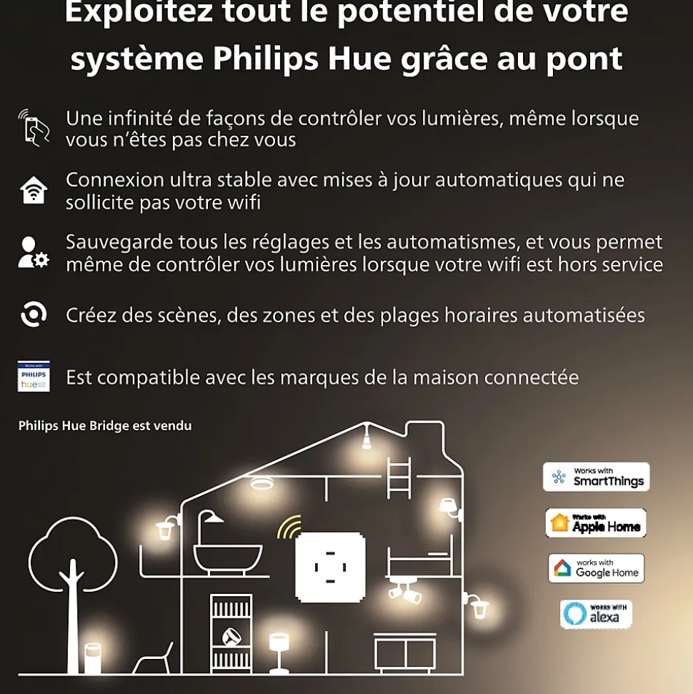 - Débloquez toute l’étendue des fonctionnalités de l’éclairage intelligent grâce au pont Hue