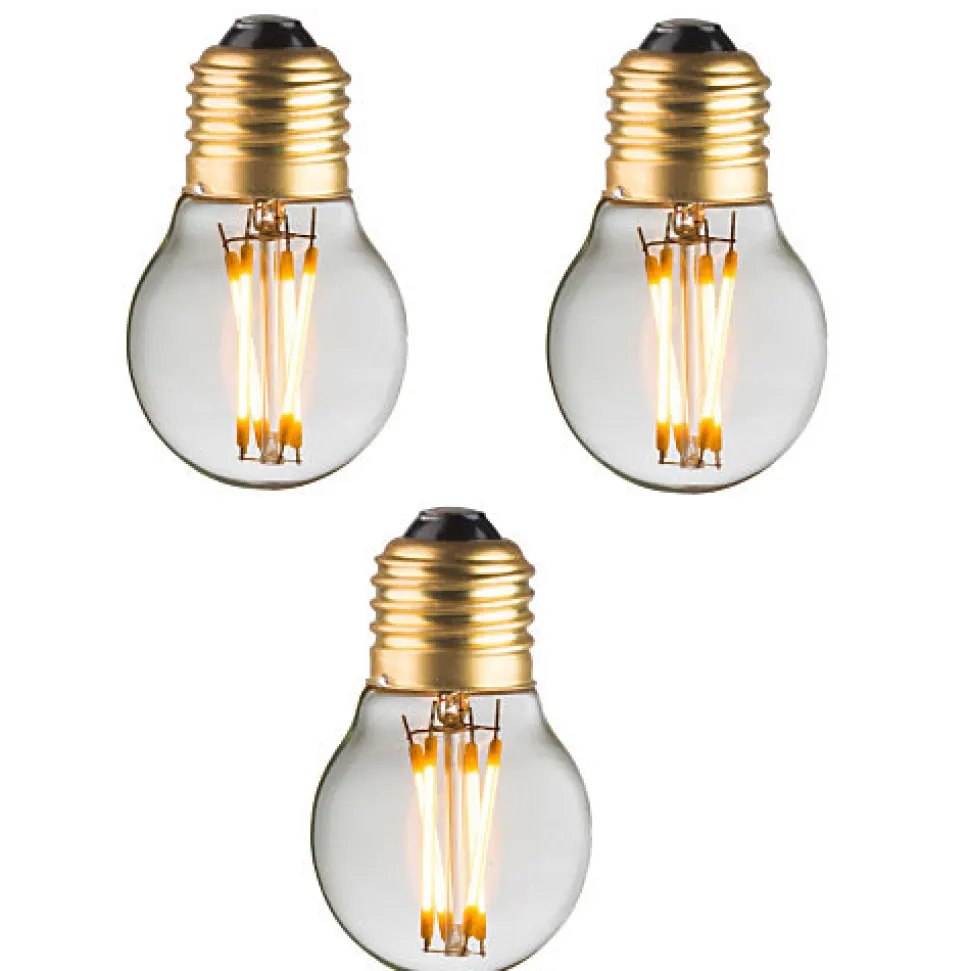 Ping vous propose :Un pack spécial et économique de 3 ampoules LED G45 E27 de style classique fonctionnant également avec variateur d’intensité (dimmable)Pour donner un côté vintage ou industriel à votre déco intérieur, rien de mieux que cette ampoule en verre transparente en forme de bulbe, laissant apparaître les filaments lumineux de LEDs effilés droits croisés.Cette ampoule se caractérise par son éclairage puissant et uniforme, sa longévité dans le temps et sa très faible consommation énergétique. Une lumière blanche chaude de 3000 K, lumière ambiante pour n’importe quel espace. Sa mise en place est aussi simple que les ampoules standards à incandescence car cette ampoule à LED est munie d’un culot E27 (vissable) et nul besoin d’abat-jour.Composée de LEDs protégées par le verre clair qui l’englobe, cette ampoule vous offrira une éclairage radial à 360°.Les plus du produit :- Economie énergétique- Nul besoin d’abat-jour- Eclairage radiant 360°- longévité dans le tempsCaractéristiques:Marque: EcolichtType : G45Libéllé 1 : G45 CLASSI