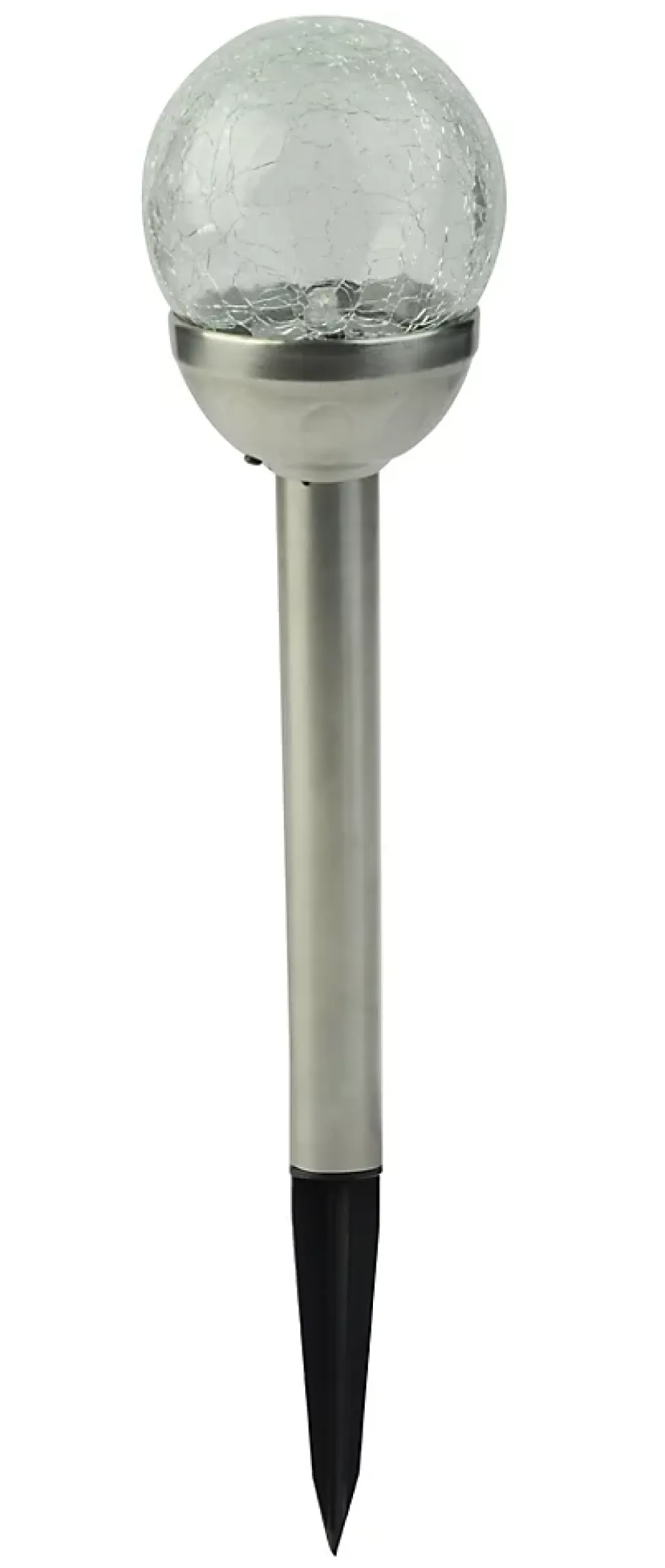 Lot de 5 lampes solaires de jardin en verre craquelé1x LED blanche/ 1x RGBLuminosité : 3 LumenDurée de vie : Jusqu’à 10 heuresMatériau : Acier inoxydable, verre