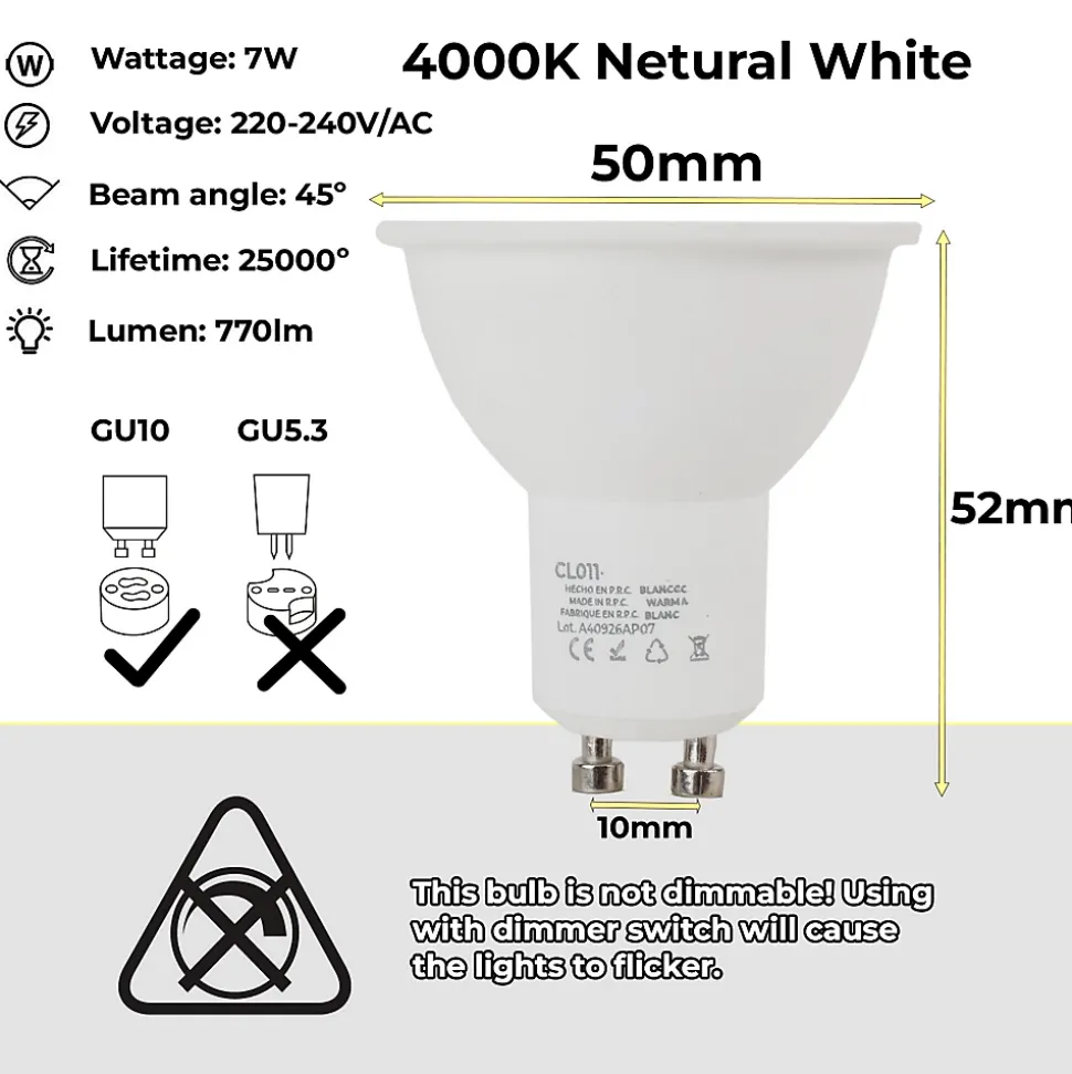 Bombillas LED GU10 7W Ø50mm, ángulo 45 La ampoule LED GU10 de 7W Ø50mm, avec un angle de 45 , est une excellente alternative aux ampoules halogènes, avec une connexion directe à 220V sans nécessité de transformateur supplémentaire. Non dimmable et facilement adaptable à différents anneaux ou spots. Elle offre des économies d’énergie significatives et est disponible dans plusieurs températures de couleur : 3000K pour des espaces confortables 4000K pour des zones de travail et de lecture 6000K pour des environnements de travail intensifs
