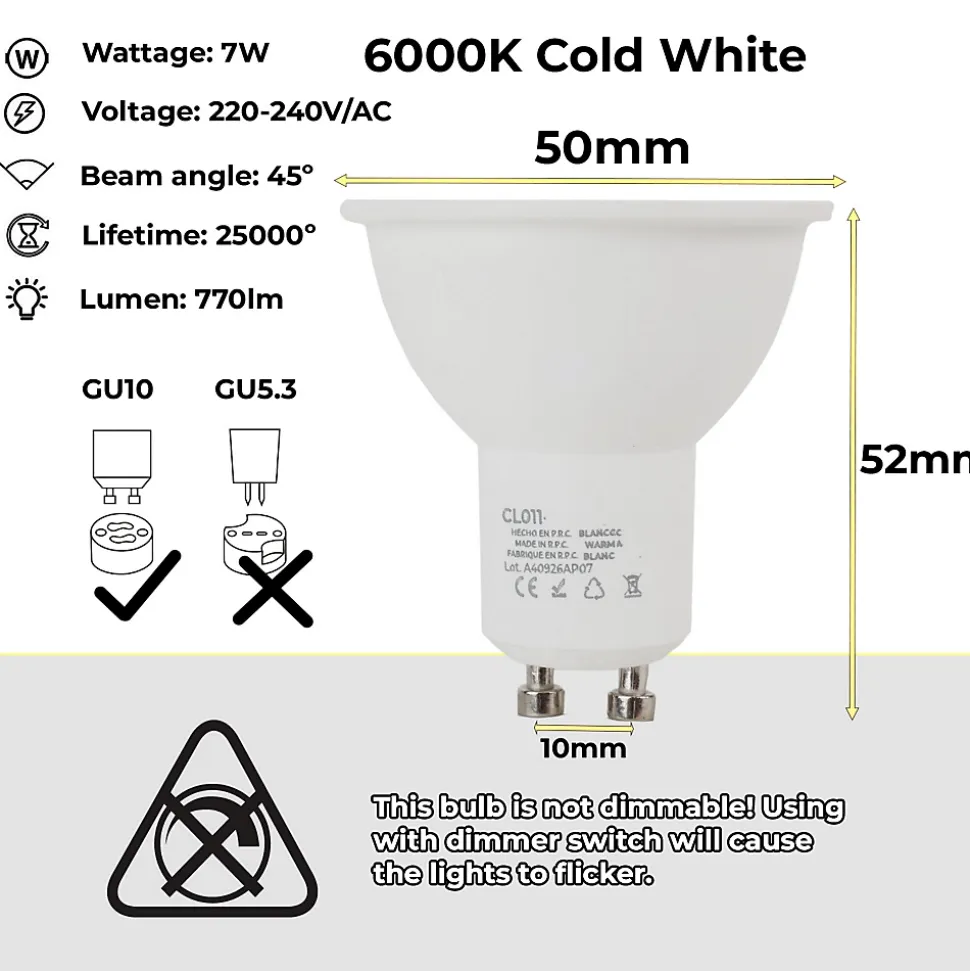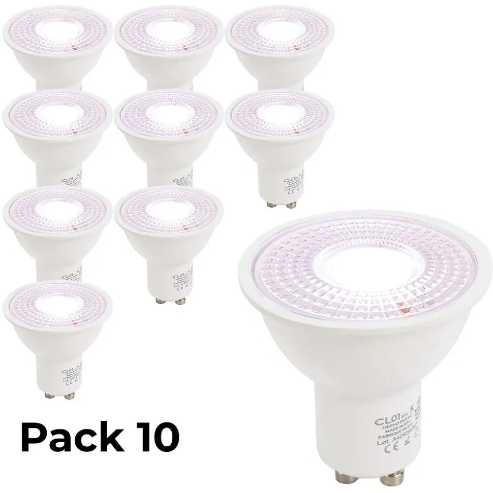 Bombillas LED GU10 7W Ø50mm, ángulo 45 La ampoule LED GU10 de 7W Ø50mm, avec un angle de 45 , est une excellente alternative aux ampoules halogènes, avec une connexion directe à 220V sans nécessité de transformateur supplémentaire. Non dimmable et facilement adaptable à différents anneaux ou spots. Elle offre des économies d’énergie significatives et est disponible dans plusieurs températures de couleur : 3000K pour des espaces confortables 4000K pour des zones de travail et de lecture 6000K pour des environnements de travail intensifs