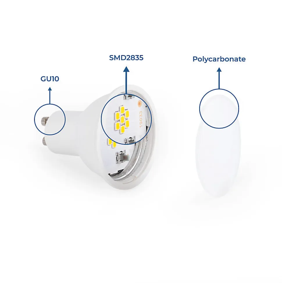 Ampoules LED GU10 7W Ø50mm, angle 120 La lampe LED GU10 de 7W est une excellente alternative aux ampoules halogènes, avec une connexion directe à 220V sans besoin de transformateur supplémentaire. Non dimmable et facilement adaptable à différents supports ou spots. Elle permet des économies dénergie significatives et est disponible en plusieurs températures de couleur : 3000K pour des espaces chaleureux et confortables 4000K pour les zones de travail et de lecture 6000K pour les environnements de travail intensifs