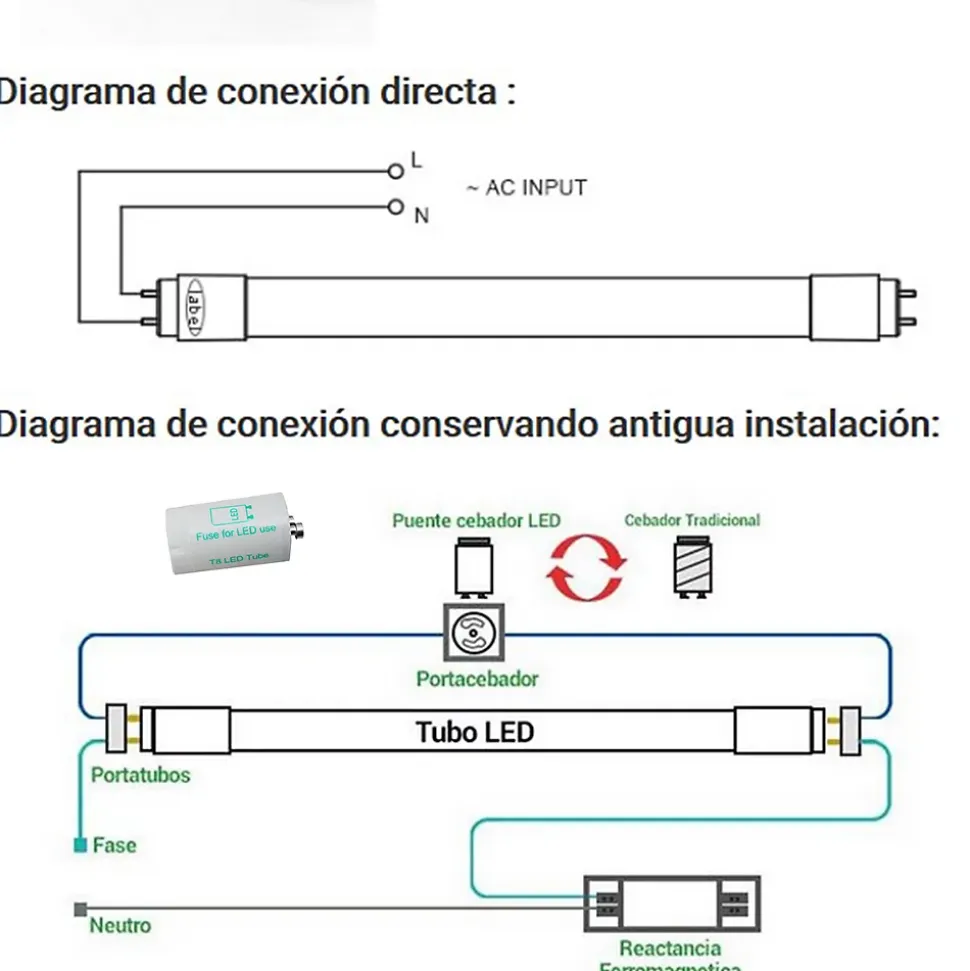 Tube LED T8 en verre 150cm 24W Caractéristiques principales : Puissance : 24W Efficacité : 112 LM/W Facteur de puissance : 0,95 Angle douverture : 330 Tension dentrée : 175V-265V Matériau : Verre et plastique haute transmission lumineuse Diamètre : Ø26mm Options de couleur : Blanc froid : 6000K, 2688 lm Blanc neutre : 4000K, 2688 lm Équivalences : 4000K (24W) = Fluorescent 58W/840 – 58W/845 6000K (24W) = Fluorescent 58W/860 – 58W/865 Installation : Ballasts ferromagnétiques : Éteindre la lumière et vérifier labsence de courant. Retirer lancien tube et le starter. Installer le pont starter LED. Retirer le condensateur. Installer le nouveau tube LED. Ballasts électroniques : Éteindre la lumière et vérifier labsence de courant. Retirer lancien tube. Déconnecter les câbles du ballast. Connecter les câbles directement au réseau électrique sur lun des supports de tubes. Signaler le support de lampe connecté. Applications : Éclairage général et remplacement des tubes fluorescents conventionnels. Idéal pour les parkings, bureaux, magasins, galeries commerciales, cuisines, etc. Parfait pour linstallation murale grâce à son large angle douverture. Inclus : Pont pour starter.